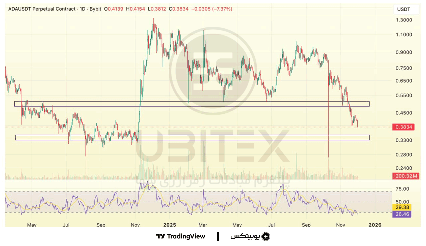 کاردانو: آدا حمایت ۰.۳۸ را شکسته و اکنون تحت فشار نزولی در مسیر ناحیهی ۰.۳۳–۰.۳۵ قرار دارد. بازگشت به بالای ۰.۳۸ میتواند فقط یک پولبک تا ۰.۴۸–۰.۵۱ باشد، اما تا زمان ماندن زیر آن، روند همچنان نزولی است.