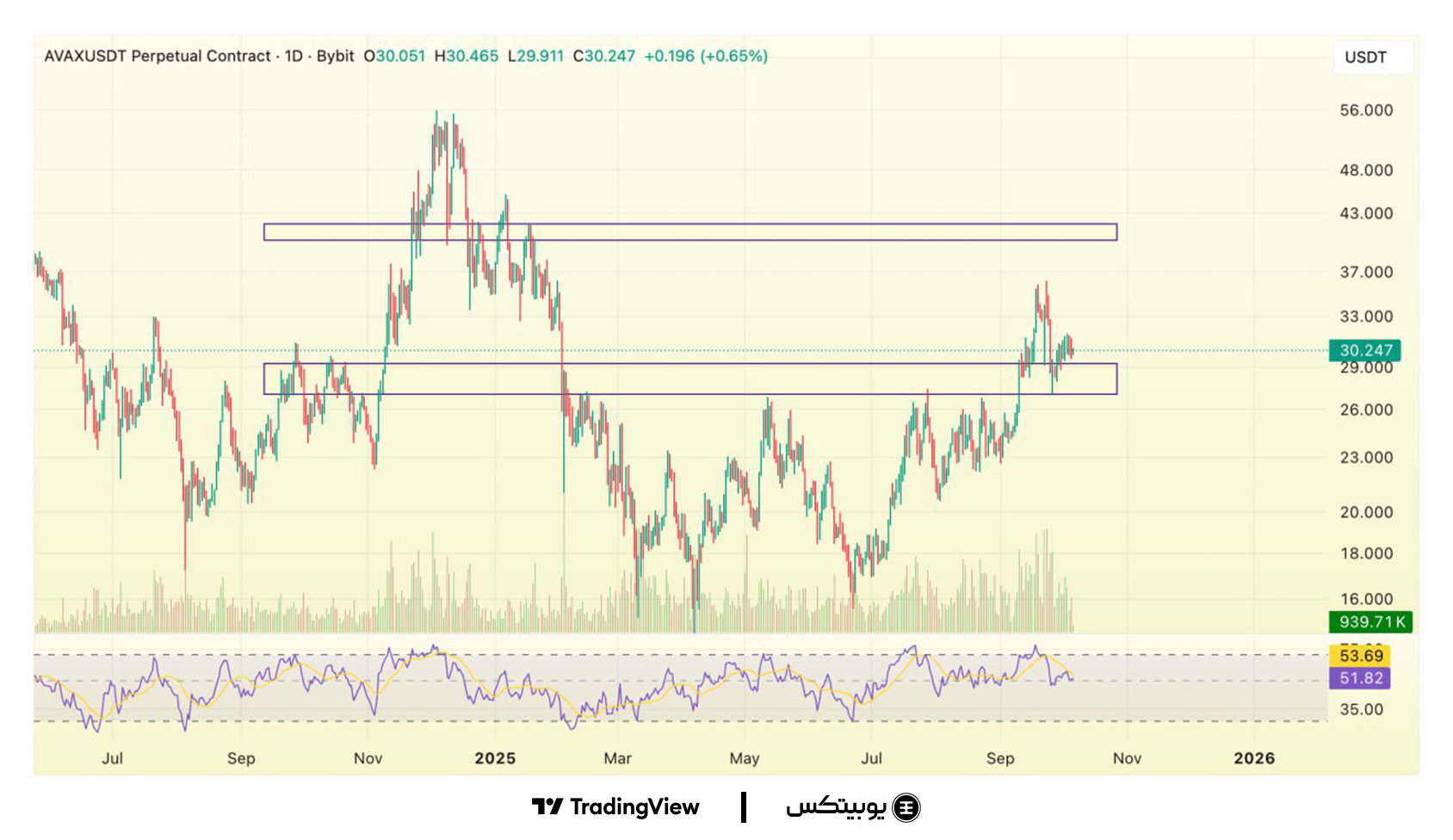 آواکس: آواکس در شرایطی قرار دارد که محدوده حمایتی ۲۷ تا ۲۹.۳ دلار نقش مهمی در جلوگیری از کاهش قیمت ایفا میکند. از سوی دیگر، مقاومت ۴۰ تا ۴۱ دلار میتواند مانع از صعود سریع باشد و عبور از آن، فرصت ادامه روند صعودی را فراهم میکند.