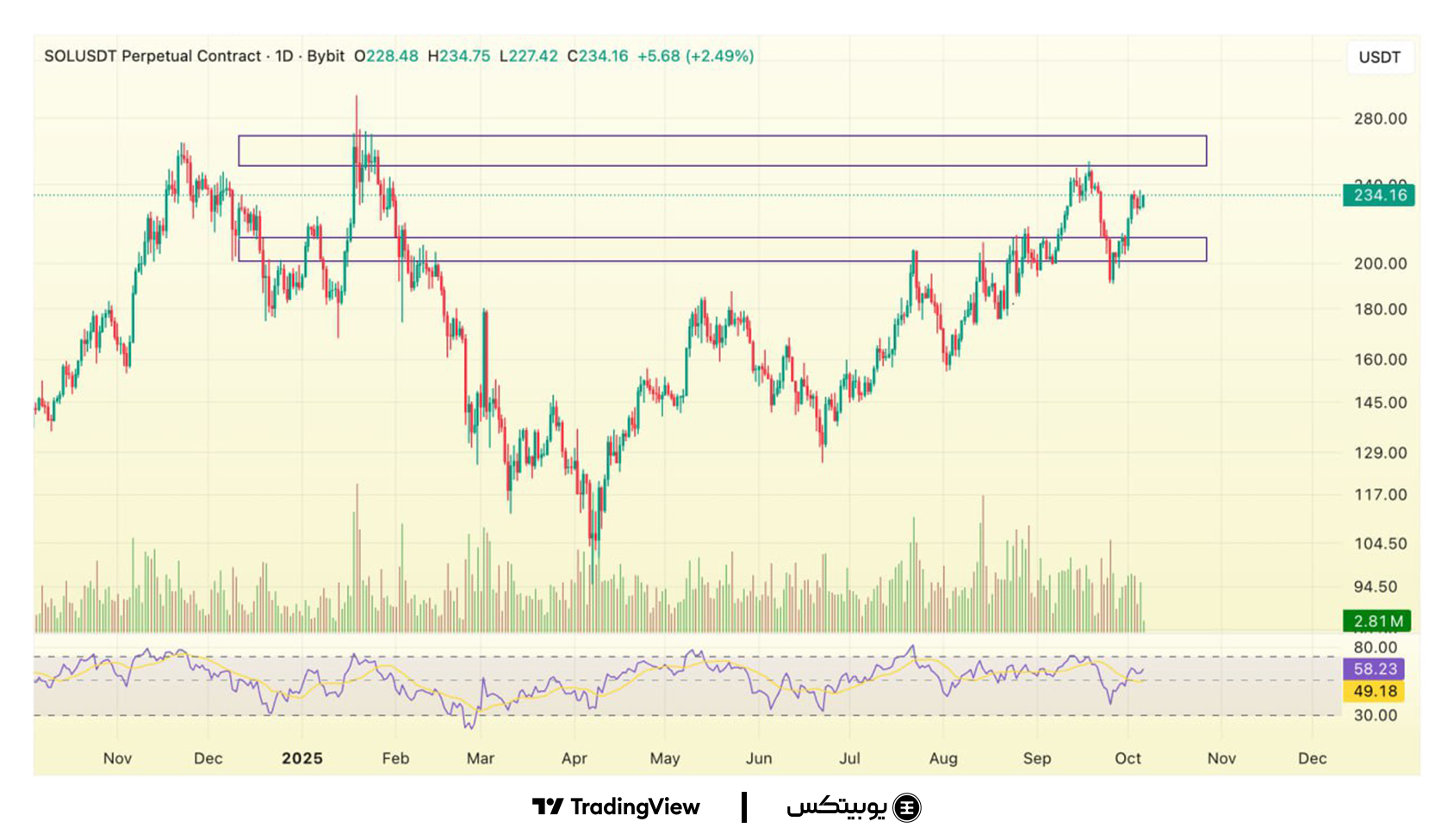 سولانا: سولانا پس از نوسانات اخیر در محدودهای حساس قرار دارد. سطح ۲۰۰ تا ۲۱۲ دلار بهعنوان حمایت کلیدی عمل میکند و حفظ آن میتواند زمینه رشد تا مقاومت ۲۵۱ تا ۲۶۹ دلار را فراهم کند. شکست هر یک از این نواحی جهت بعدی روند را مشخص خواهد کرد.