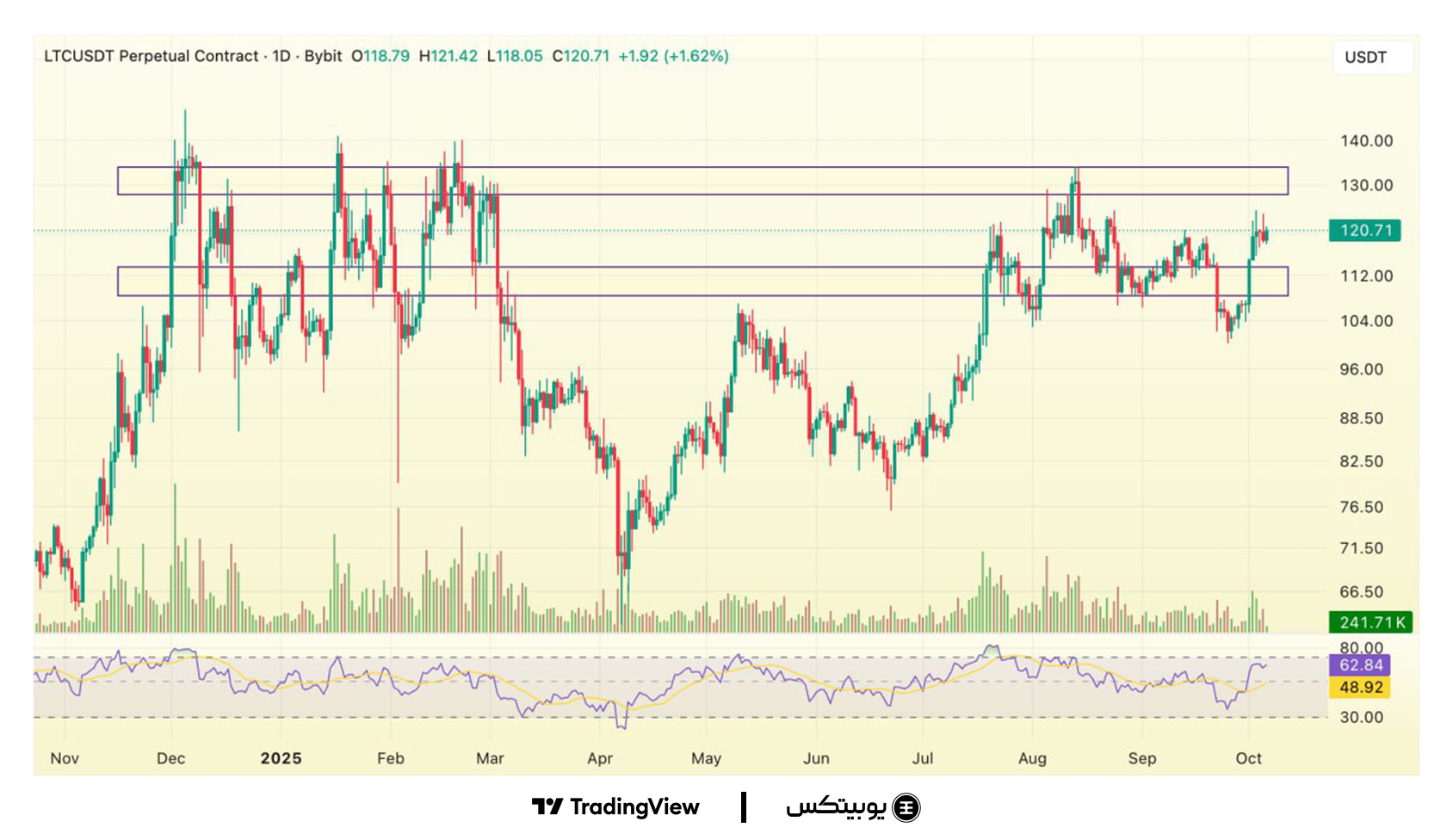 لایت کوین: لایتکوین پس از نوسانات اخیر، وارد فاز تصمیمگیری شده است. محدوده ۱۰۸ تا ۱۱۳ دلار بهعنوان ناحیه حمایتی کلیدی در نظر گرفته میشود و حفظ آن میتواند نشانهای از تداوم قدرت خریداران باشد. در مقابل، محدوده ۱۲۸ تا ۱۳۴ دلار مقاومت اصلی محسوب میشود که شکست آن میتواند مسیر حرکت به سطوح بالاتر را هموار کند.