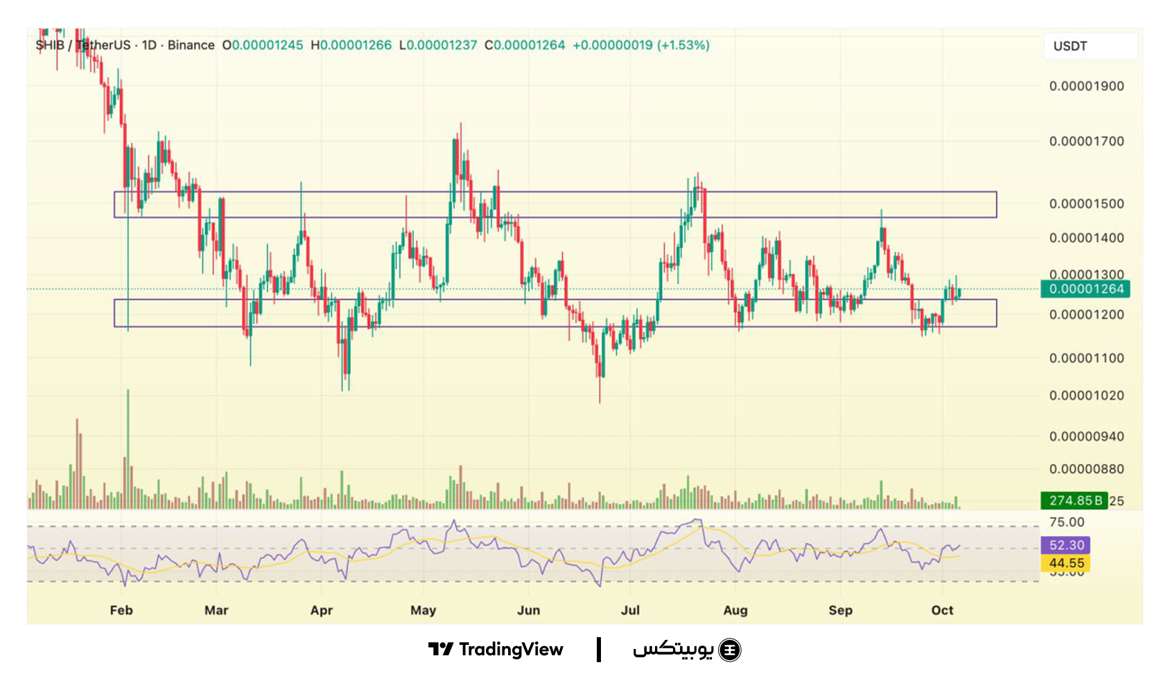 شیبا: حمایت اصلی شسبا بین ۰.۰۰۰۰۱۱۷ تا ۰.۰۰۰۰۱۲۳ دلار قرار گرفته و میتواند از کاهش بیشتر جلوگیری کند. مقاومت مهم نیز در بازه ۰.۰۰۰۰۱۴۵ تا ۰.۰۰۰۰۱۵۳ دلار واقع شده که عبور از آن میتواند مسیر رشد کوتاهمدت شیبا را هموار سازد.