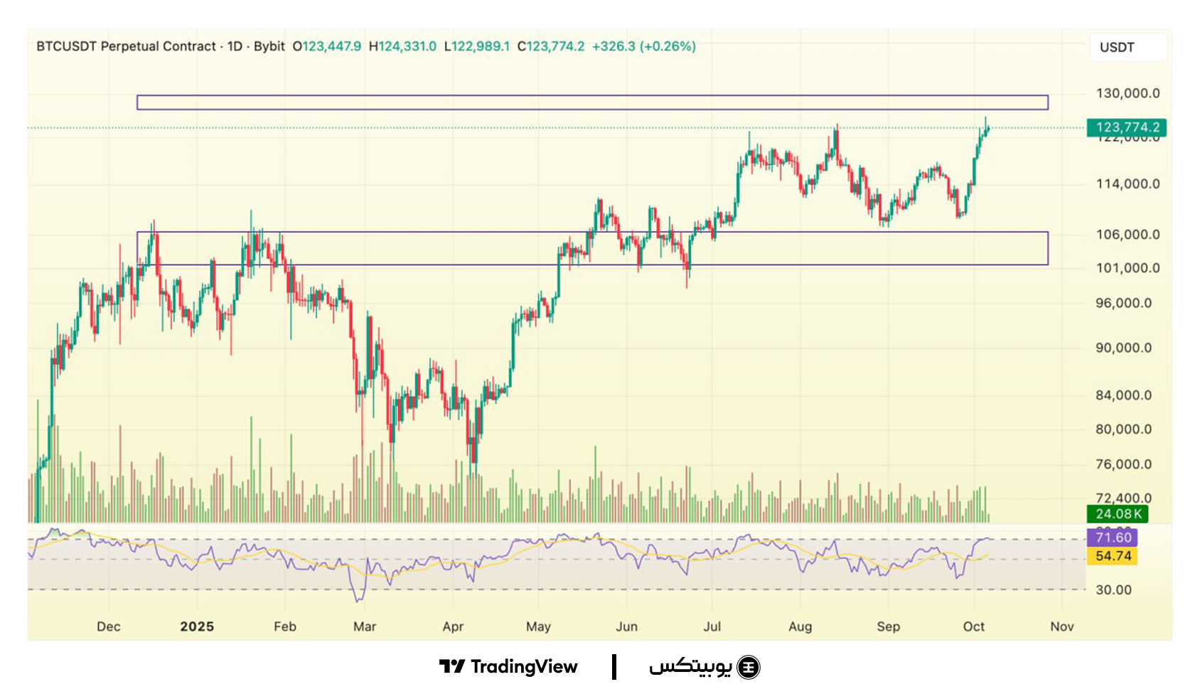 تلفن تماس: 91001716 - ساعت 9 الی 17امروز، دوشنبه 14 مهر 1404، برابر با 6 اکتبر 2025 میلادی، اولین روز از هفته معاملاتی آغاز شده است. هفته گذشته برای بیتکوین و بازار ارزهای دیجیتال به طور کلی، هفتهای پرهیجان بود. بیتکوین توانست سقف تاریخی خود را بشکند و رکورد ۱۲۵,۷۰۰ دلار را ثبت کند، رشد ۱۰٪ در طول هفته باعث شد سهم بیتکوین از بازار به ۶۰٪ برسد و حجم قابل توجهی سرمایه وارد بازار شود. این رشد چشمگیر نشاندهنده تسلط بیتکوین و جذابیت بالای آن برای سرمایهگذاران است.