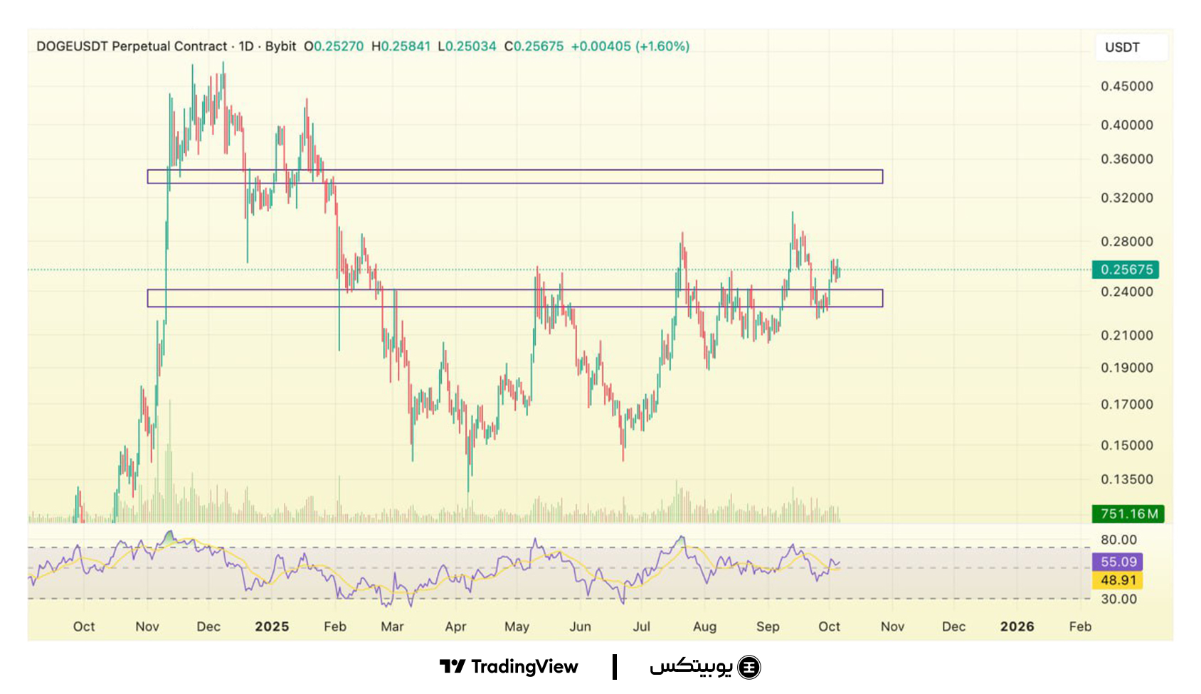 دوج کوین: دوجکوین در محدودهای حیاتی قرار دارد. سطح ۰.۲۲۸ تا ۰.۲۴۱ دلار بهعنوان حمایت اصلی عمل میکند و میتواند از کاهش بیشتر قیمت جلوگیری کند. در سوی دیگر، محدوده ۰.۳۳۴ تا ۰.۳۴۸ دلار مقاومت کلیدی است که عبور از آن میتواند حرکت صعودی جدیدی را آغاز نماید.