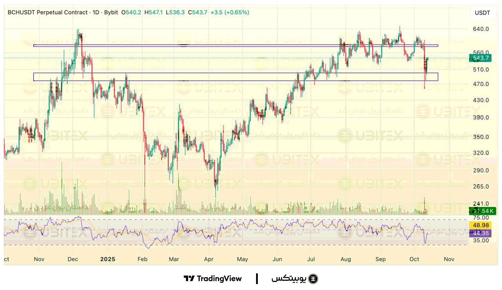 بیتکوین کش: در یک محدوده حساس تکنیکال قرار دارد.حمایت این رمزارز بین ۴۷۸ تا ۵۰۰ دلار تعریف شده و میتواند از کاهش بیشتر قیمت جلوگیری کند. محدوده مقاومتی در بازه ۵۷۹ تا ۵۸۵ دلار واقع شده و عبور از آن میتواند نشانهای از ادامه حرکت صعودی BCH باشد.