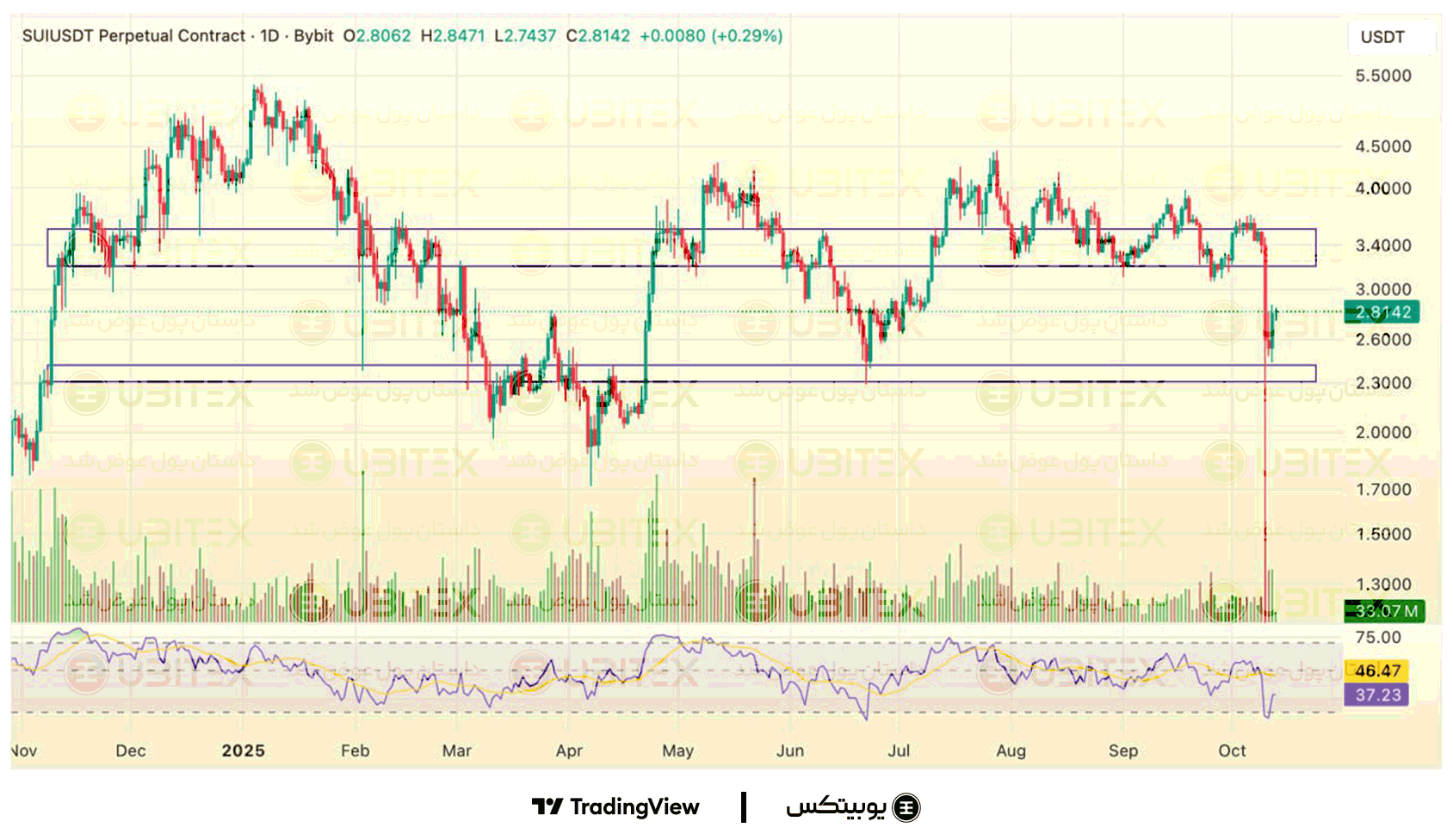 سویی: سویی در محدودهای پرنوسان قرار گرفته است. محدوده حمایتی این رمزارز بین ۲.۳ تا ۲.۴ دلار قرار دارد که میتواند مانع افت بیشتر قیمت شود. در مقابل، محدوده مقاومتی بین ۳.۲ تا ۳.۵ دلار است و عبور از آن میتواند سیگنال مثبتی برای ادامه روند صعودی باشد.