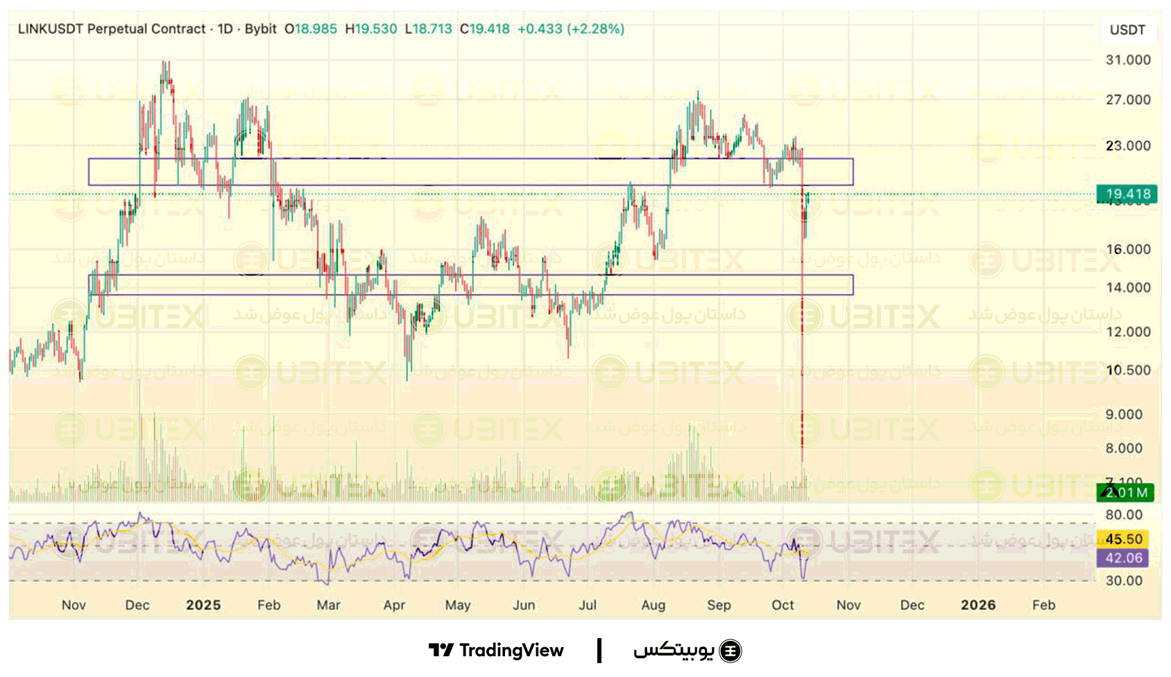 چین لینک: چین لینک در محدودهای حساس برای تعیین جهت حرکت قرار دارد. حمایت این رمزارز بین ۱۳.۷ تا ۱۴.۷ دلار واقع شده و میتواند مانع افت بیشتر قیمت شود. محدوده مقاومتی بین ۲۰.۰ تا ۲۲.۰ دلار قرار دارد و عبور از آن میتواند نشانهای از شروع روند صعودی جدید باشد.