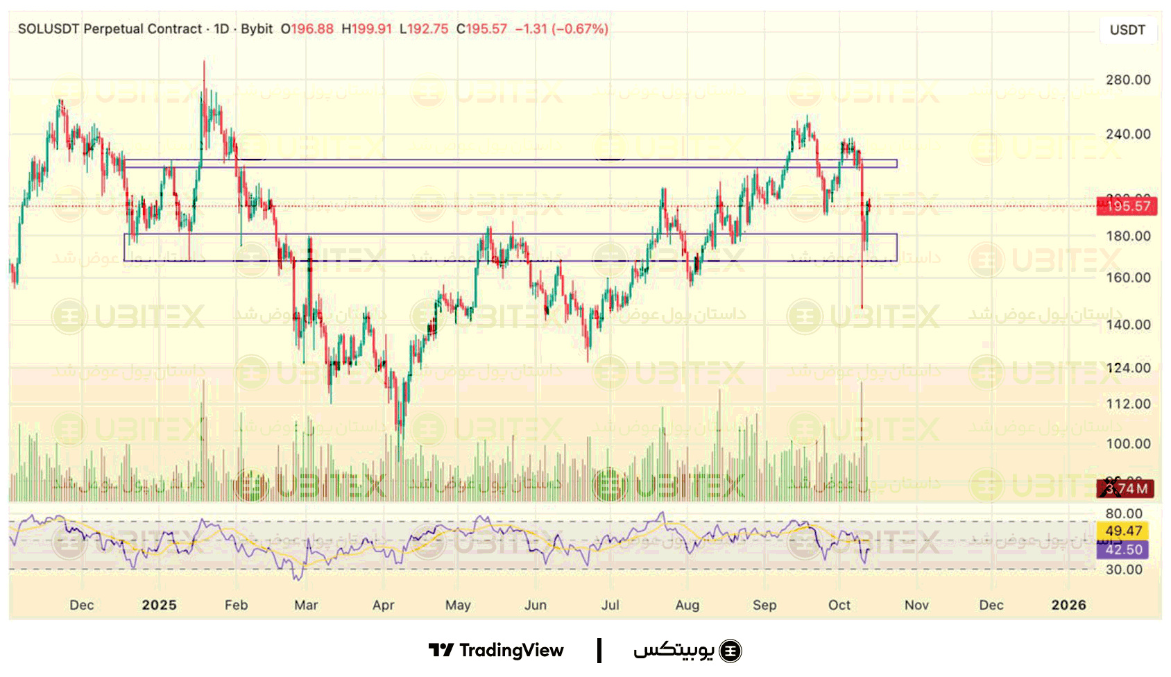 سولانا: سولانا در حال حاضر در یک محدوده کلیدی معامله میشود. محدوده حمایتی آن بین ۱۶۷ تا ۱۸۰ دلار قرار دارد و میتواند بهعنوان سطح حفظ روند صعودی عمل کند. محدوده مقاومتی نیز بین ۲۱۸ تا ۲۲۳ دلار است و عبور پرقدرت از این سطح میتواند سیگنال ادامه رشد قیمت را تقویت کند.