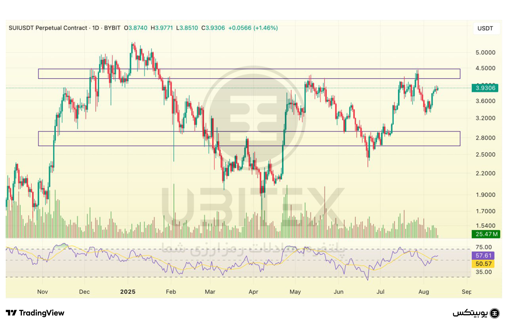 سویی: سویی محدود حمایتی خود را بین ۲.۶۵ تا ۲.۹ دلار تثبیت کرده است و محدوده مقاومتی آن بین ۴.۱۸ تا ۴.۴۷ دلار قرار دارد. مقاومت موجود در این بازه، مانعی مهم برای رشد بیشتر است و عبور از آن میتواند روند صعودی جدیدی را آغاز کند.