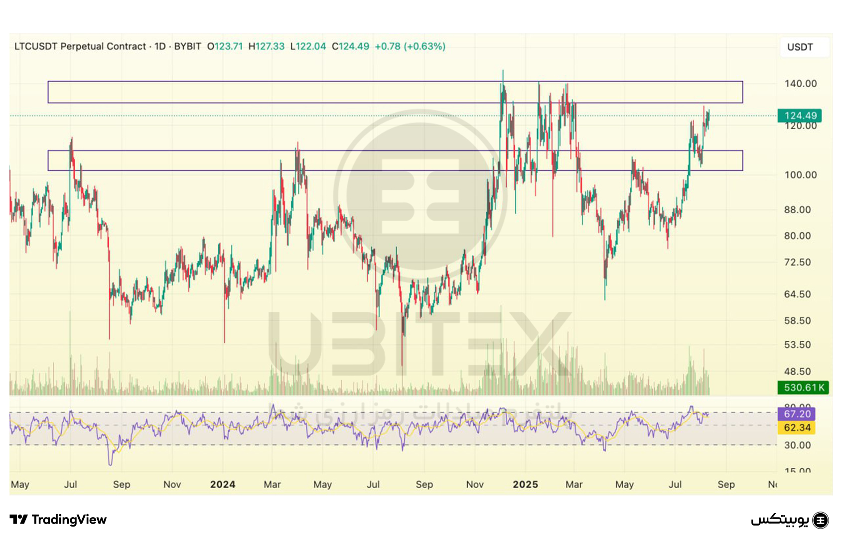 لایت کوین: لایت کوین محدوده حمایتی خود را بین ۱۰۱ تا ۱۰۹ دلار حفظ کرده و محدوده مقاومتی آن در بازه ۱۳۰ تا ۱۴۱ دلار قرار دارد. این سطوح کلیدی میتوانند جهت حرکت بعدی قیمت را تعیین کنند؛ حفظ حمایت میتواند موجب رشد شود و شکست آن ممکن است به اصلاح قیمت منجر شود.