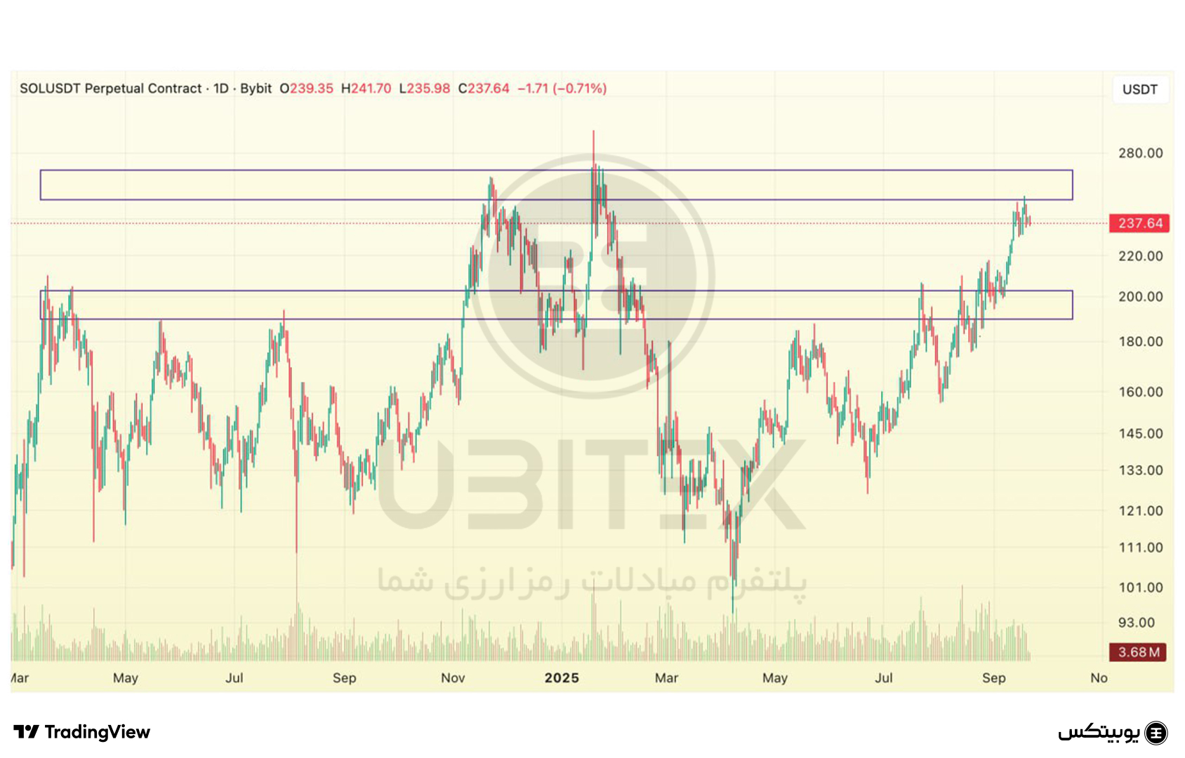 سولانا: در چارت سولانا، محدوده حمایتی در بازه ۱۸۹ تا ۲۰۲ دلار قرار دارد و مقاومتها بین ۲۵۱ تا ۲۶۹ دلار تعریف شدهاند. نوسان قیمت در این سطوح میتواند چشمانداز جدیدی از قدرت روند صعودی یا احتمال اصلاح در سولانا ارائه دهد.