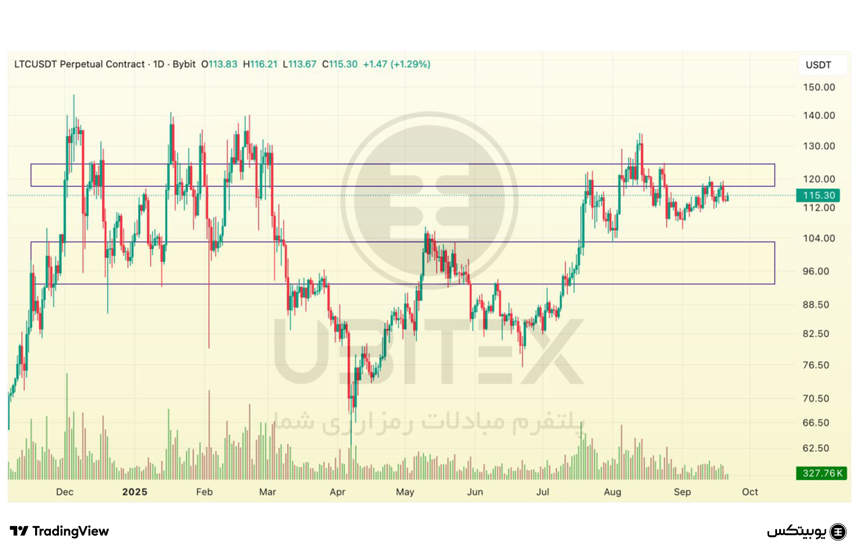لایت کوین: در لایتکوین، محدوده حمایتی در بازه ۹۳ تا ۱۰۳ دلار تعیین شده و مقاومتها بین ۱۱۷ تا ۱۲۴ دلار قرار دارند. رفتار قیمت در این نواحی میتواند بیانگر میزان آمادگی بازار برای آغاز یک حرکت پرقدرت در لایت کوین باشد.