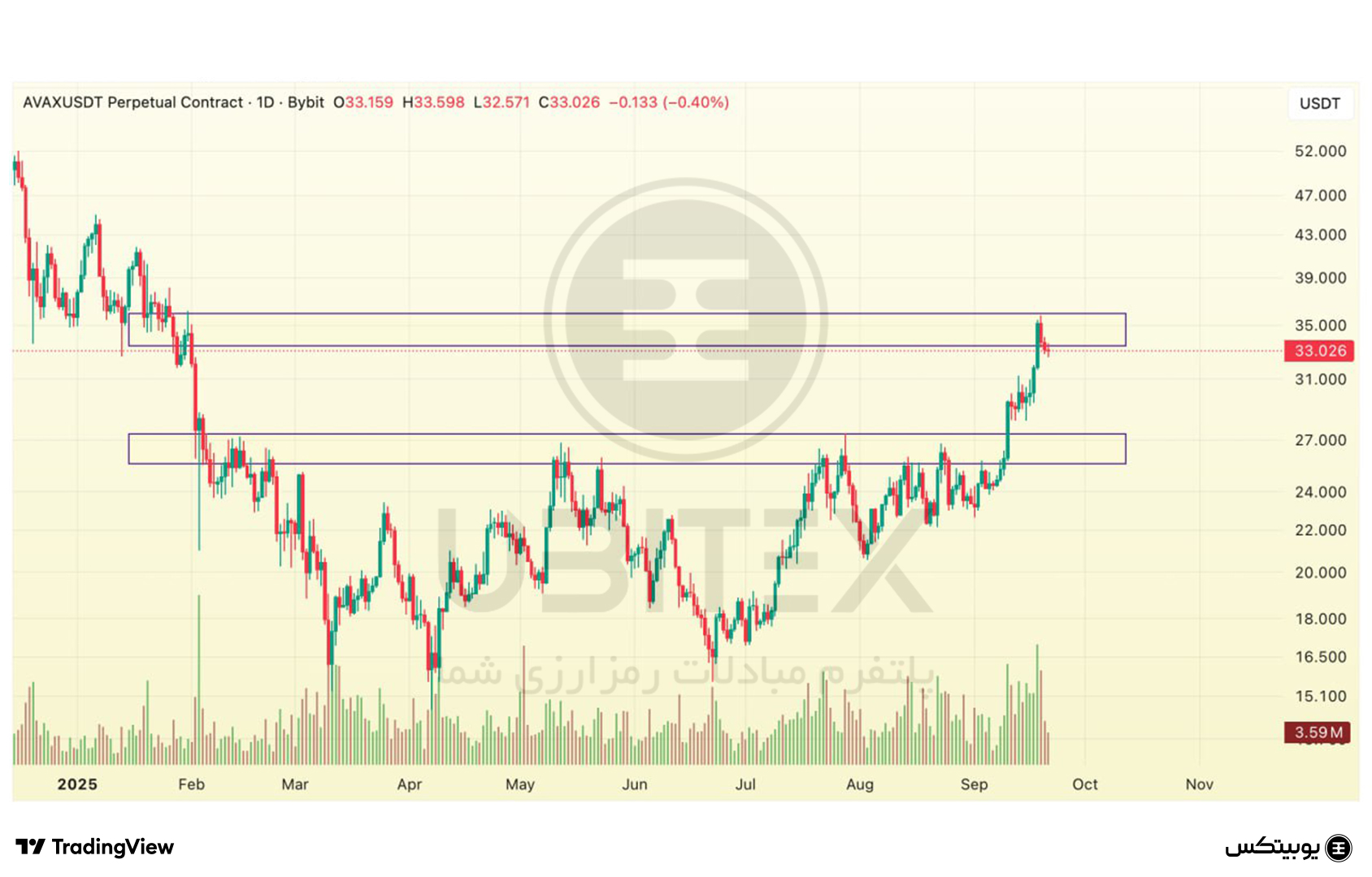 آواکس: در آواکس، محدوده حمایتی بین ۲۵.۶ تا ۲۷.۳ دلار تعریف شده و مقاومتها در بازه ۳۳.۴ تا ۳۵.۹ دلار قرار دارند. رفتار قیمت در این سطوح میتواند سرنخهایی درباره قدرت روند فعلی و فرصتهای معاملاتی کوتاهمدت آواکس ارائه کند.