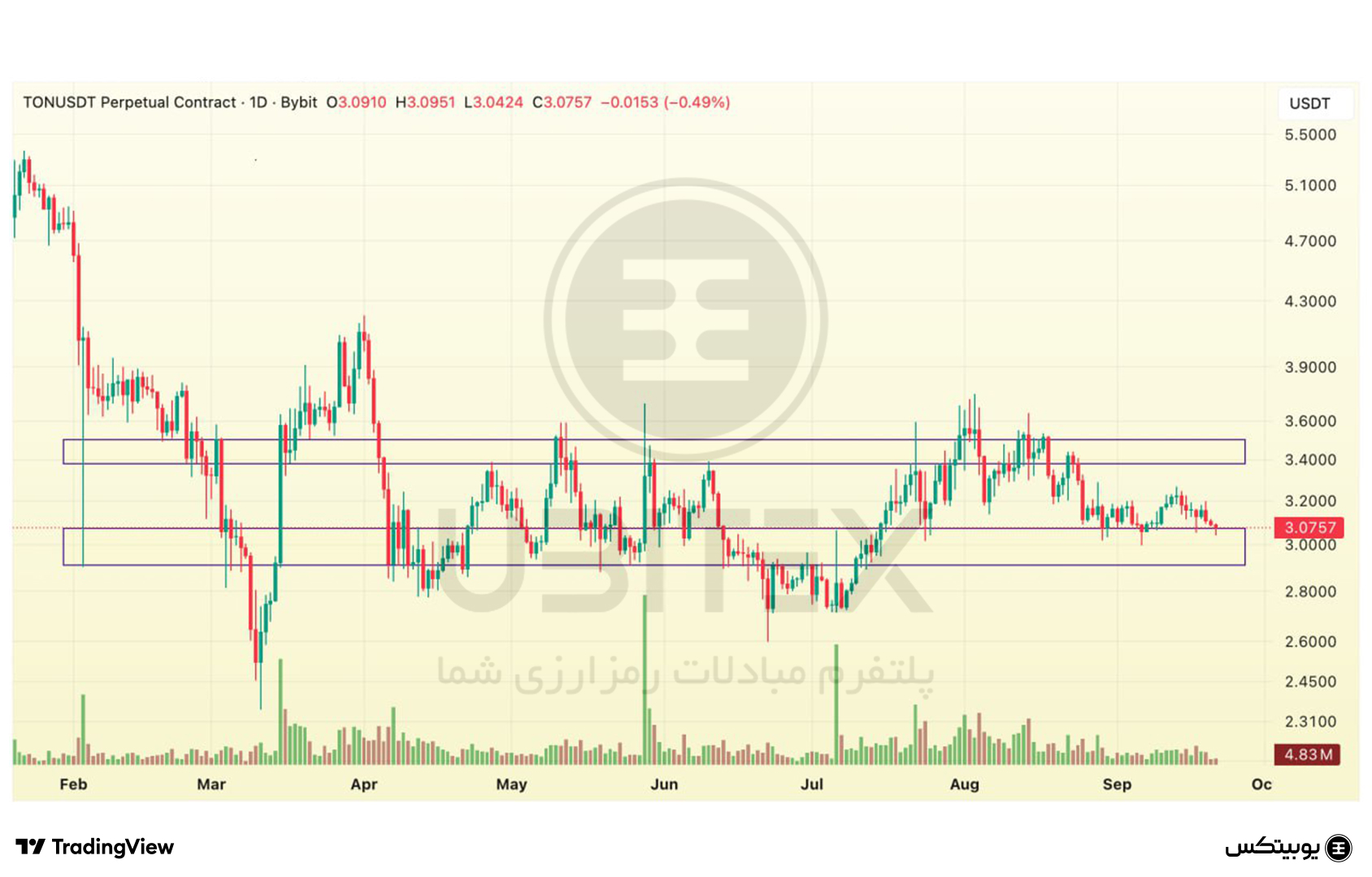 تون کوین: در نمودار تونکوین، محدوده حمایتی در بازه ۲.۹۱ تا ۳.۰۷ دلار مشخص شده و مقاومتها بین ۳.۳۸ تا ۳.۵۰ دلار قرار دارند. واکنش قیمت به این سطوح میتواند تصویر واضحتری از گرایش بازار و نقاط احتمالی تصمیمگیری برای معاملهگران ارائه دهد.