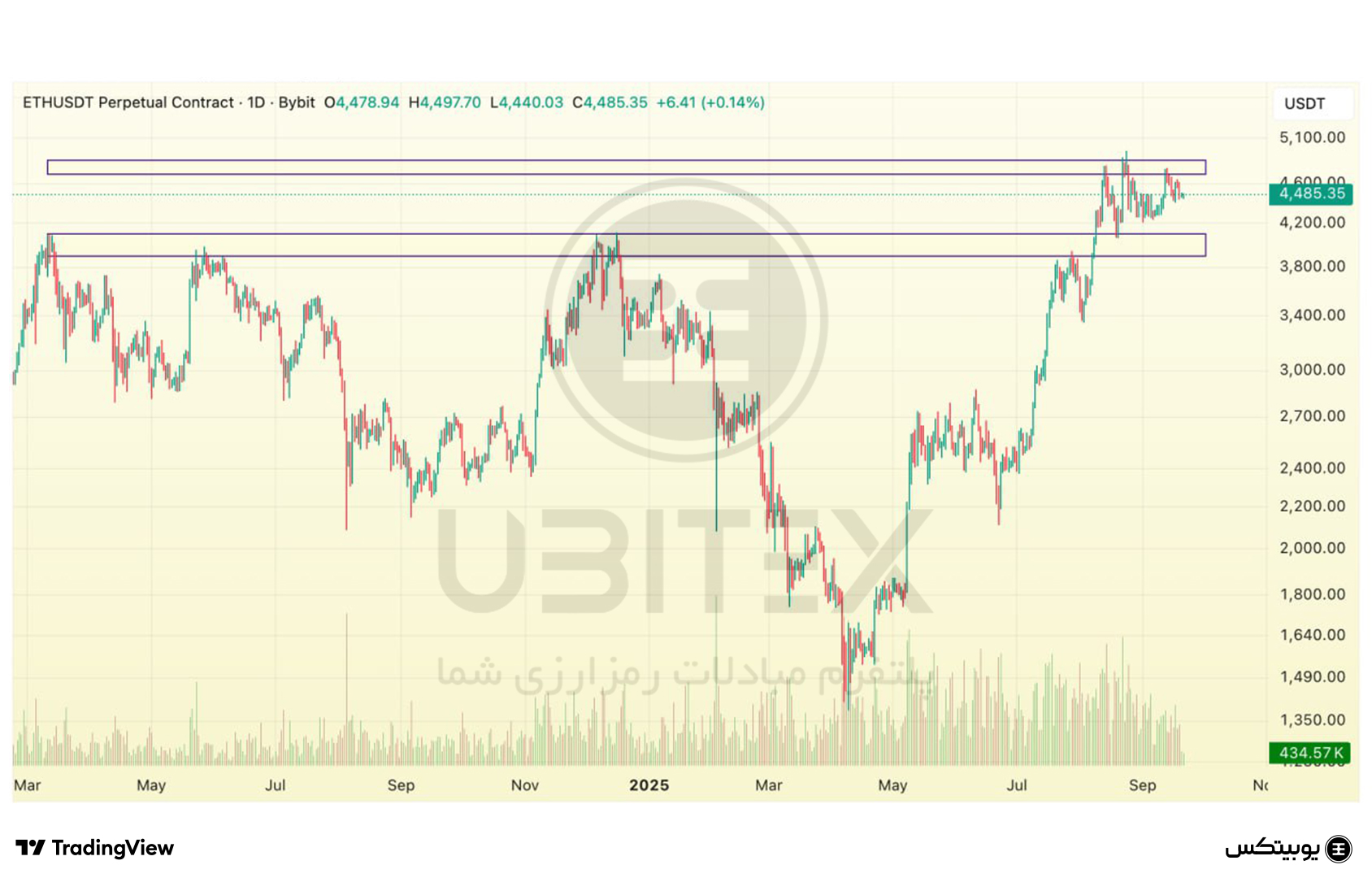 اتریوم: در اتریوم، محدوده حمایتی بین ۳,۹۰۰ تا ۴,۱۰۰ دلار مشخص شده و مقاومتها در بازه ۴,۷۰۰ تا ۴,۸۵۰ دلار قرار دارند. واکنش قیمت به این سطوح میتواند نشانهای از تمایل بازار به تداوم روند فعلی یا آغاز حرکتی تازه در اتریوم باشد.