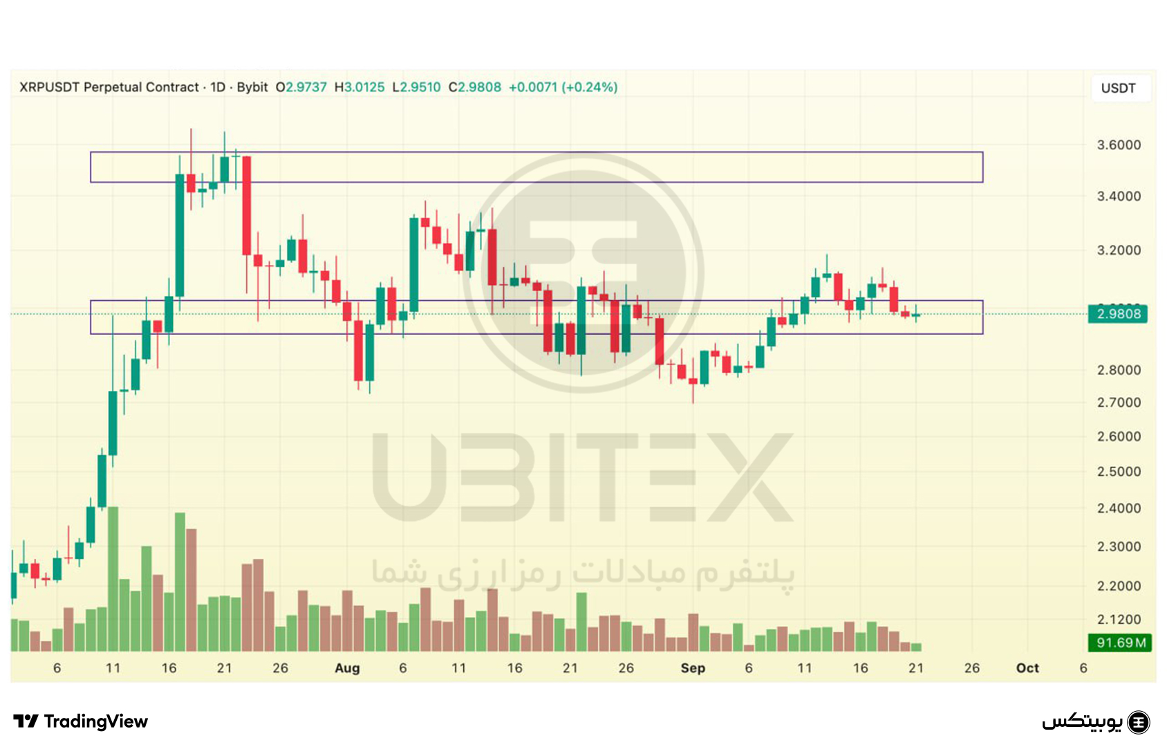 ریپل: در نمودار ریپل، محدوده حمایتی بین ۲.۹۰ تا ۳.۰۰ دلار مشخص شده و مقاومتها در بازه ۳.۴۵ تا ۳.۵۵ دلار قرار دارند. واکنش قیمت به این نواحی میتواند سرنخهایی درباره پایداری روند فعلی و جهت بعدی حرکت ریپل ارائه کند.