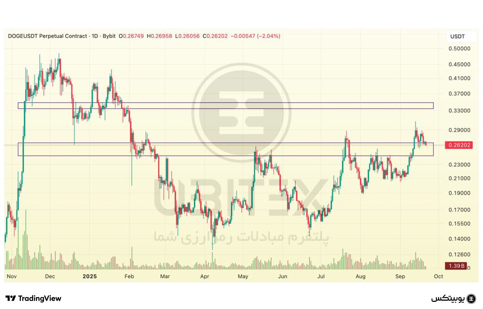 دوج کوین: در نمودار دوجکوین، محدوده حمایتی بین ۰.۲۴۲ تا ۰.۲۶۲ دلار تعیین شده و مقاومتها در بازه ۰.۳۳۴ تا ۰.۳۴۸ دلار قرار دارند. واکنش قیمت به این سطوح میتواند نکات مهمی درباره فشار خرید و فروش کوتاهمدت دوج ارائه کند و نقاط ورود یا خروج محتمل را مشخص نماید.
