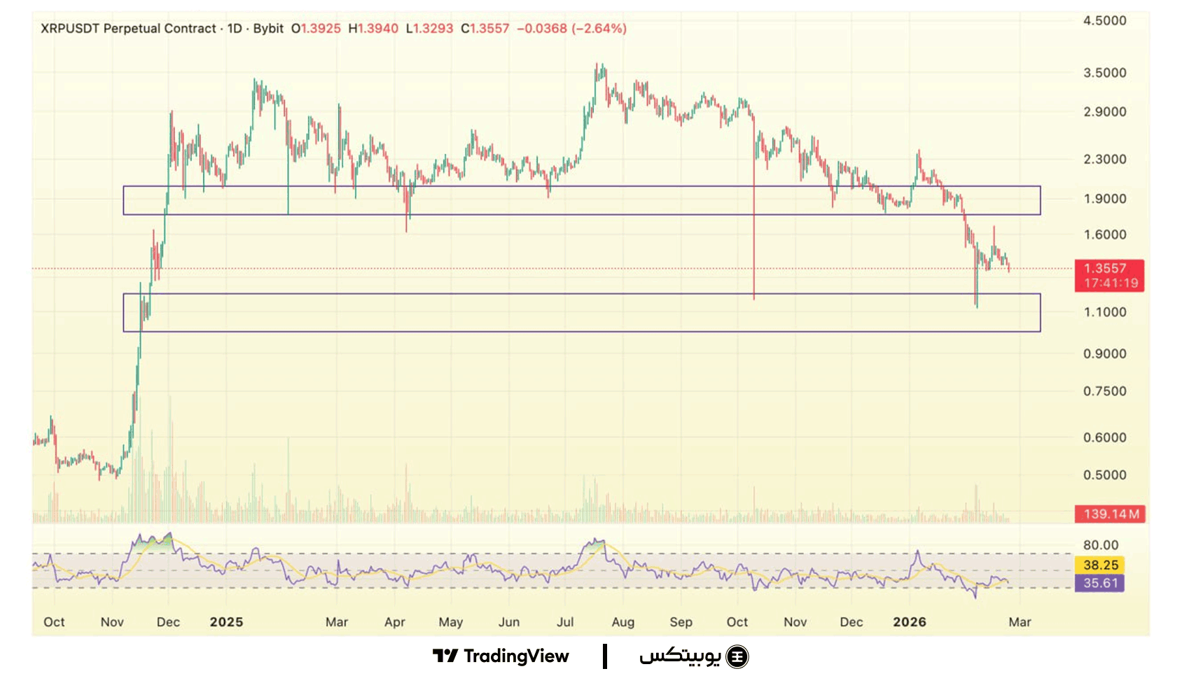 ریپل پس از از دست دادن ساختار صعودی کوتاهمدت وارد فاز اصلاحی شده و اکنون به محدوده حمایتی ۱ تا ۱.۲ دلار نزدیک شده است که میتواند محل واکنش خریداران و شکلگیری یک حرکت اصلاحی باشد؛ در صورت بازگشت قیمت، محدوده مقاومتی ۱.۷۵ تا ۲ دلار بهعنوان ناحیه عرضه مهم عمل میکند که عبور از آن میتواند نشانهای از بازگشت قدرت به روند بازار باشد.