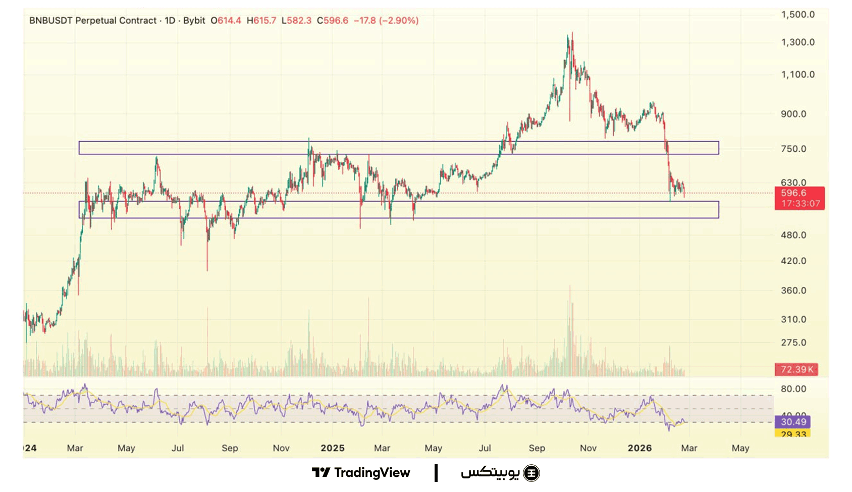 بایننسکوین پس از اصلاح تند اخیر اکنون در حال نزدیک شدن به محدوده حمایتی ۵۲۳ تا ۵۷۱ دلار است که میتواند ناحیه واکنش خریداران و تلاش برای تثبیت قیمت باشد؛ در صورت شکلگیری بازگشت، محدوده مقاومتی ۷۳۰ تا ۷۸۰ دلار بهعنوان ناحیه عرضه مهم عمل میکند که عبور از آن میتواند نشانهای از کاهش فشار فروش و بازگشت تدریجی مومنتوم صعودی باشد.
