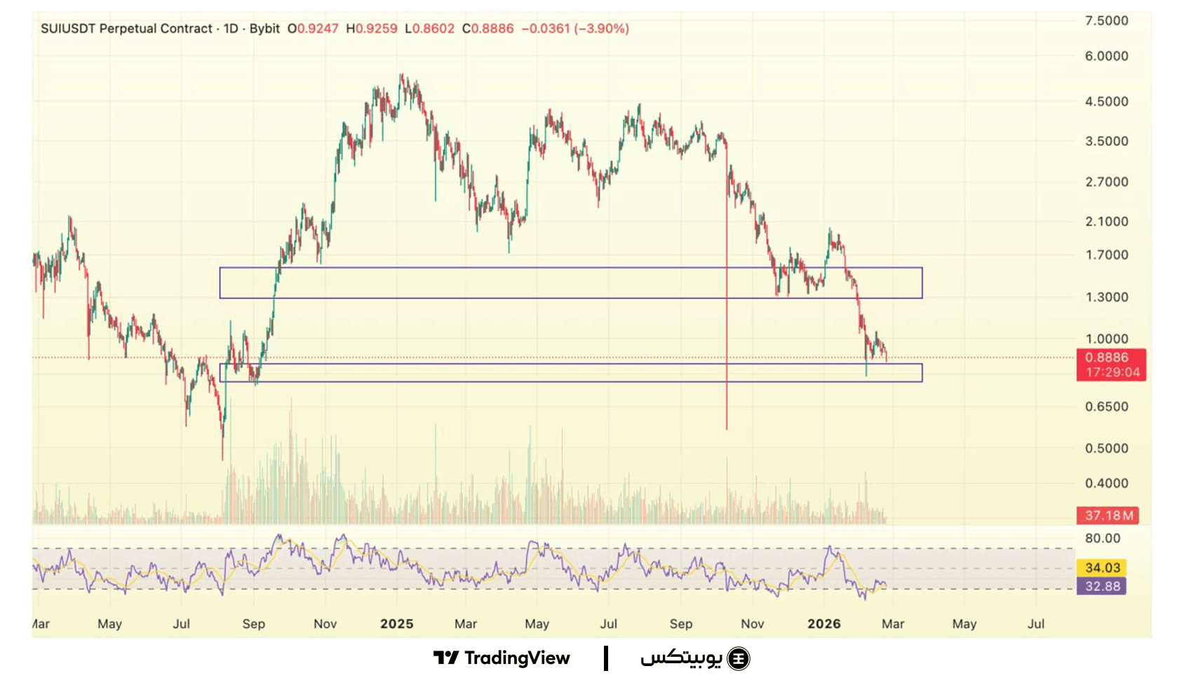 سویی پس از شکست حمایتهای میانی وارد فاز اصلاحی عمیقتری شده و اکنون در حال نزدیک شدن به محدوده حمایتی ۰.۷۶ تا ۰.۸۵ دلار است که میتواند محل واکنش کوتاهمدت خریداران باشد؛ در صورت شکلگیری بازگشت قیمت، محدوده مقاومتی ۱.۲۹ تا ۱.۵۶ دلار بهعنوان ناحیه عرضه مهم عمل میکند که عبور از آن میتواند نشانهای از کاهش فشار فروش و آغاز فاز بازیابی در بازار باشد.