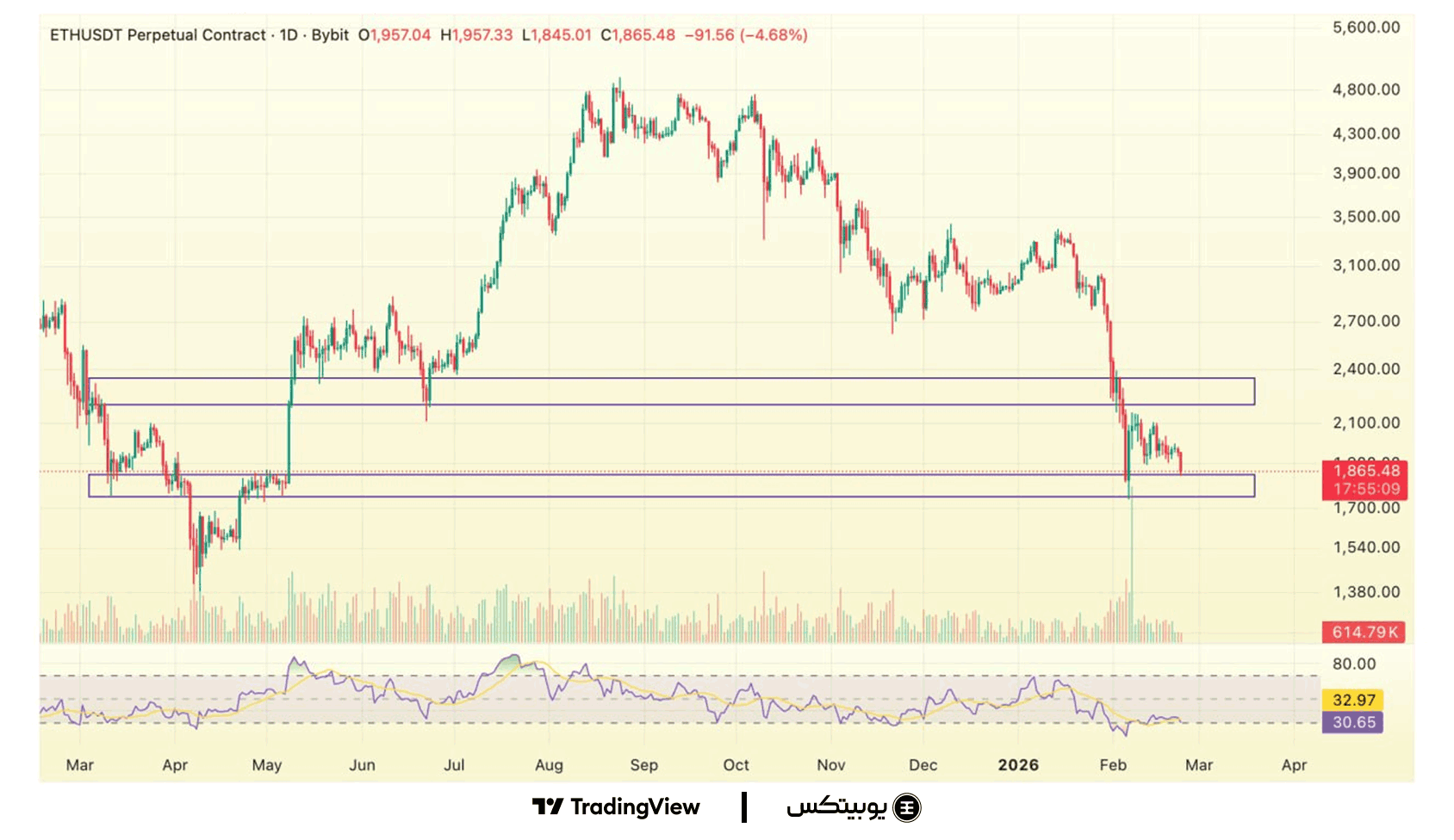 اتریوم پس از ریزش تند اخیر اکنون در حال واکنش به محدوده حمایتی ۱۷۵۰ تا ۱۸۵۰ دلار است؛ حفظ این ناحیه میتواند باعث شکلگیری یک حرکت اصلاحی در کوتاهمدت شود، اما در صورت بازگشت تقاضا، محدوده مقاومتی ۲۲۰۰ تا ۲۳۵۰ دلار بهعنوان سد عرضه مهم عمل میکند که عبور از آن میتواند نشانهای از تلاش بازار برای تغییر مومنتوم نزولی باشد.
