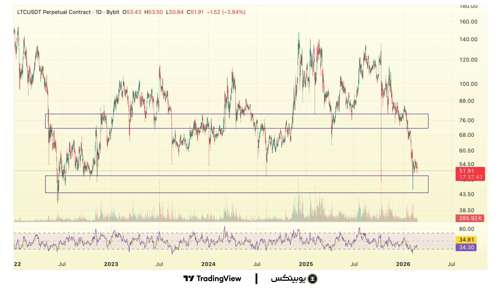 لایتکوین پس از شکست حمایتهای میانی وارد فاز اصلاحی عمیقتری شده و اکنون به محدوده حمایتی ۴۴ تا ۵۰ دلار نزدیک شده است که میتواند محل واکنش کوتاهمدت خریداران باشد؛ در صورت شکلگیری بازگشت قیمتی، محدوده مقاومتی ۷۱ تا ۷۹ دلار بهعنوان ناحیه عرضه مهم عمل میکند که عبور از آن میتواند نشانهای از کاهش فشار فروش و تلاش بازار برای بازیابی روند باشد.