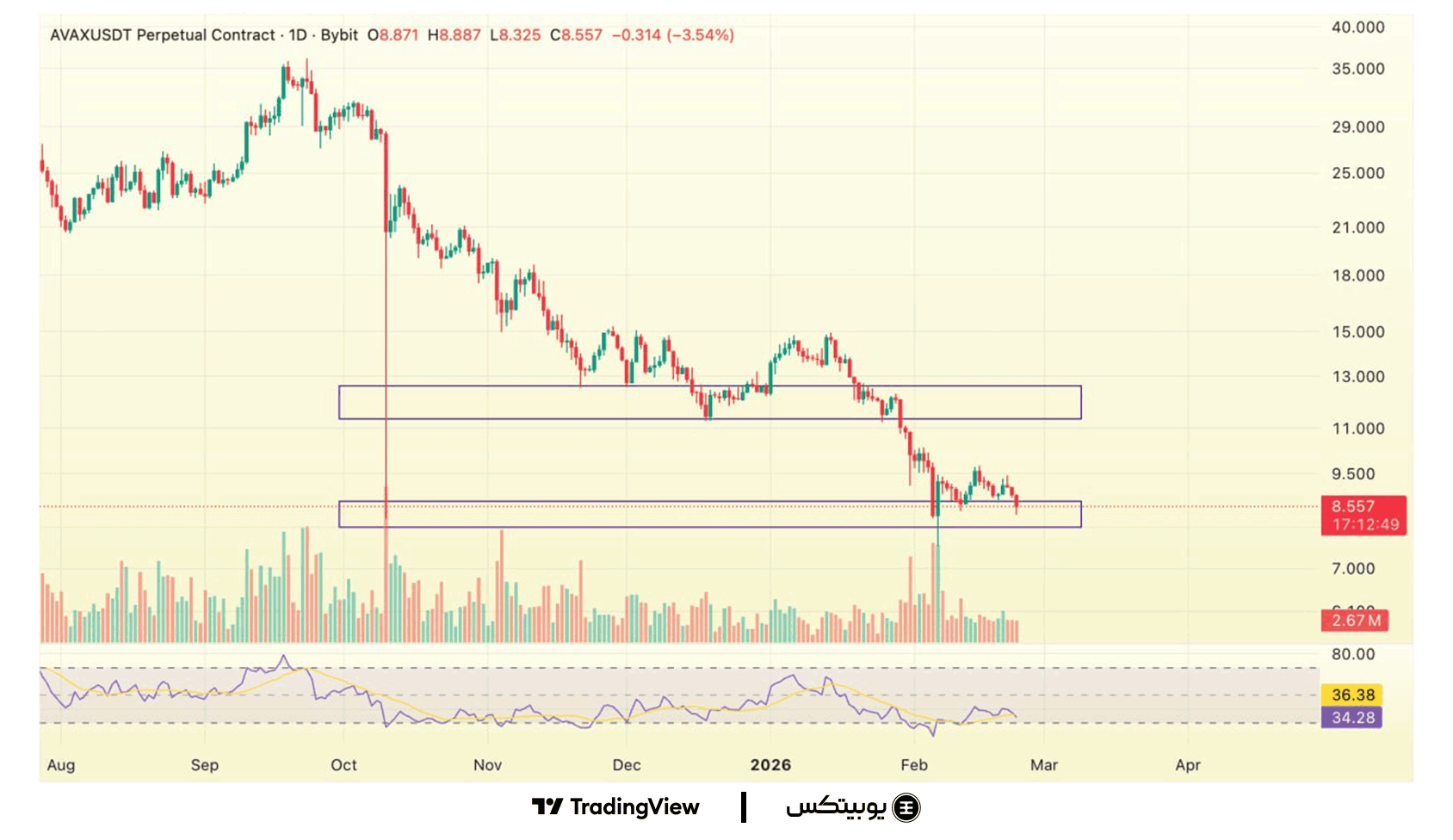 آوالانچ پس از یک روند نزولی پیوسته اکنون در حال نوسان نزدیک محدوده حمایتی ۸ تا ۸.۵ دلار است که میتواند ناحیهای برای کاهش فشار فروش و شکلگیری واکنش کوتاهمدت خریداران باشد؛ در صورت بازگشت قیمت، محدوده مقاومتی ۱۱.۳ تا ۱۲.۶ دلار بهعنوان ناحیه عرضه مهم عمل میکند که عبور از آن میتواند نشانهای از شروع فاز بازیابی در روند بازار باشد.