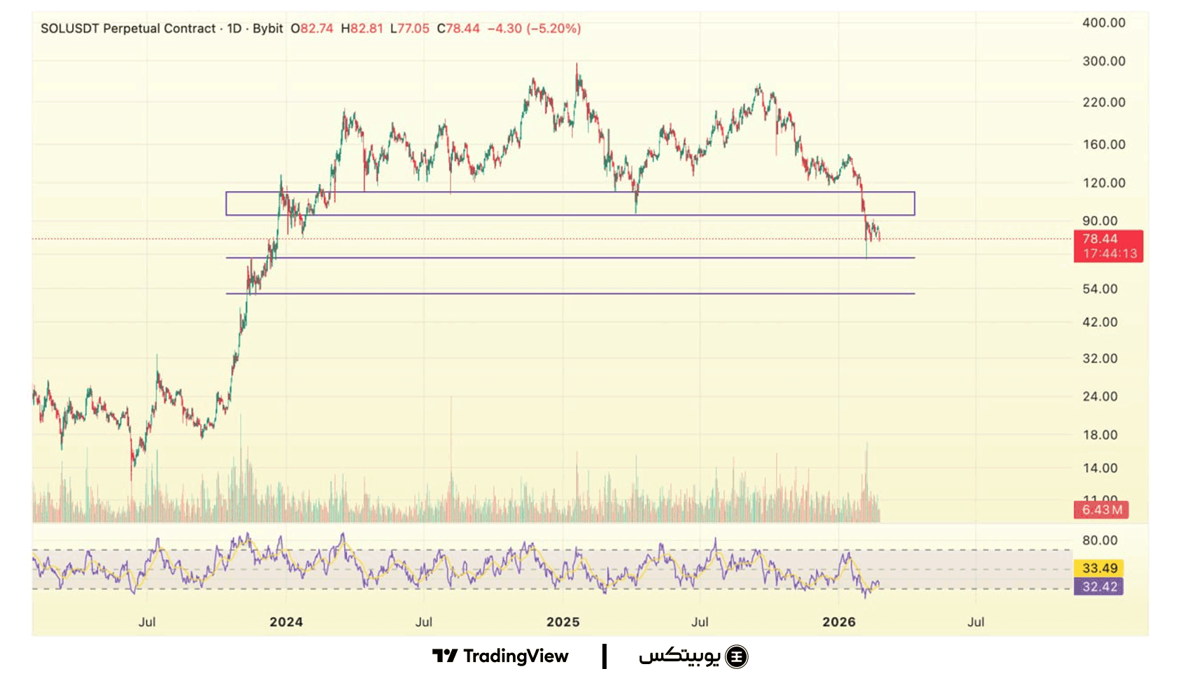 سولانا پس از شکست حمایتهای میانی وارد فاز اصلاح عمیقتری شده و اکنون نزدیک محدودههای حمایتی قرار دارد؛ حمایت اولیه در ۶۸ دلار میتواند محل واکنش کوتاهمدت بازار باشد و در صورت از دست رفتن آن، حمایت مهم بعدی در محدوده ۵۲ دلار قرار میگیرد. در سناریوی بازگشت قیمت سولانا، محدوده مقاومتی ۹۴ تا ۱۱۲ دلار بهعنوان ناحیه عرضه اصلی عمل میکند که عبور از آن میتواند نشانهای از کاهش فشار فروش و آغاز یک فاز بازیابی در بازار باشد.