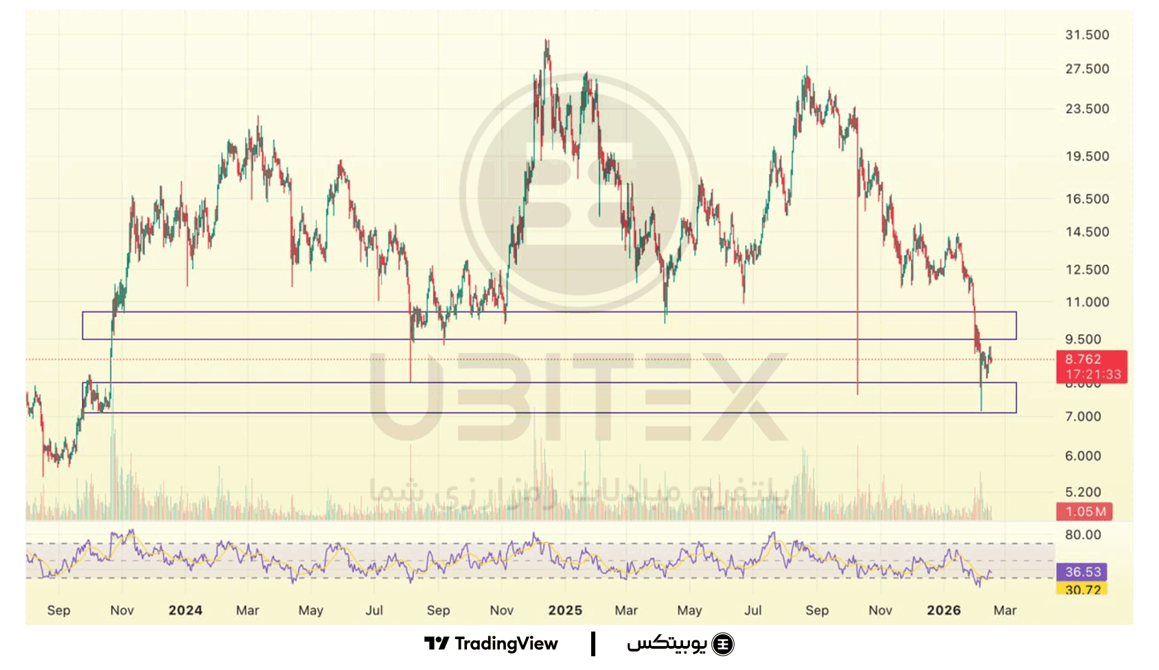 آوالانچ پس از یک ریزش فرسایشی، در محدودهی حمایتی ۸–۸.۷ دلار در حال نوسان است که نقش کف کوتاهمدت بازار را دارد. در صورت تثبیت و جذب تقاضا، حرکت اصلاحی تا مقاومت ۱۱.۳–۱۲.۶ دلار محتمل خواهد بود؛ از دسترفتن حمایت، سناریوی ادامهی ضعف ساختاری را فعال میکند.