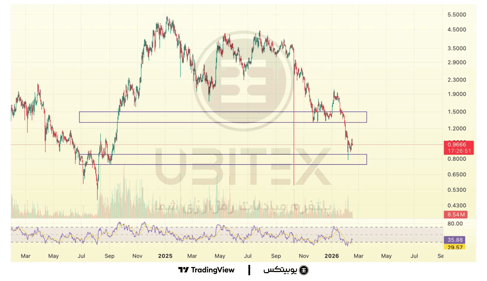 سوئی پس از شکست حمایتهای بالاتر وارد فاز اصلاحی شده و اکنون روی محدودهی حمایتی ۰.۷۵–۰.۸۵ دلار قرار دارد که نقش کف کوتاهمدت را بازی میکند. در صورت تثبیت این ناحیه، سناریوی برگشت و نوسان تا مقاومت ۱.۳–۱.۵ دلار فعال میشود؛ از دسترفتن حمایت، ریسک ادامهی فشار فروش را افزایش میدهد.