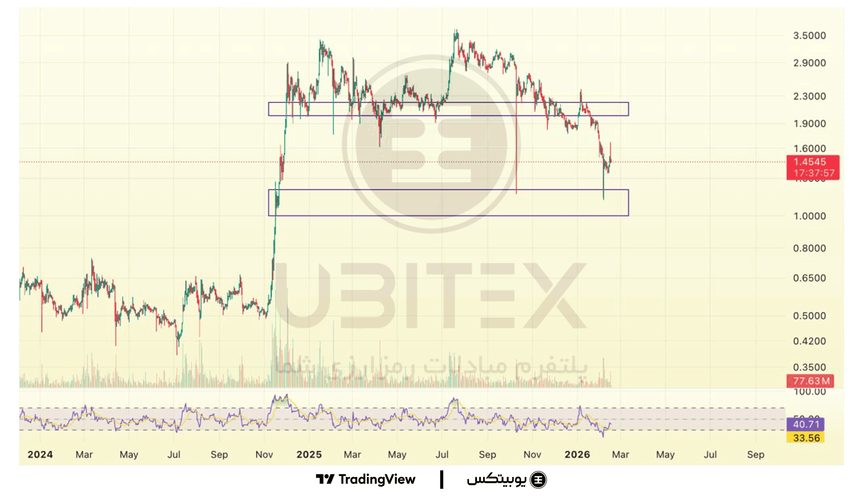 اتریوم پس از ریزش تند، وارد محدودهی حمایتی ۱۷۵۰-۱۸۵۰ دلار شده که همزمان با اشباع فروش RSI است و میتواند ناحیهی واکنش کوتاهمدت باشد. با تثبیت بالای این حمایت، حرکت اصلاحی تا مقاومت ۲۲۵۰-۲۳۰۰ دلار محتمل است؛ اما از دسترفتن این محدوده، سناریوی ضعف و فشار فروش بیشتر را فعال میکند.