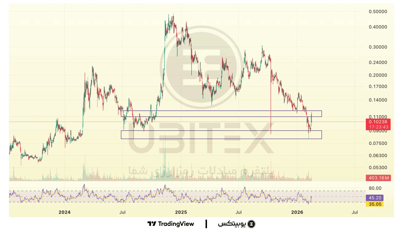 دوجکوین پس از ریزش پیوسته، به محدودهی حمایتی ۰.۰۸–۰.۰۹ دلار رسیده که ناحیهی کلیدی برای توقف فشار فروش و شکلگیری کف کوتاهمدت است. در صورت تثبیت این حمایت، حرکت اصلاحی تا مقاومت ۰.۱۱–۰.۱۲ دلار محتمل خواهد بود؛ از دسترفتن حمایت، سناریوی ضعف بیشتر را فعال میکند.
