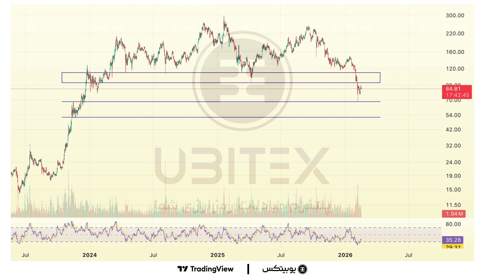سولانا با شکست حمایت میانی وارد فاز اصلاحی شده و فعلاً واکنش قیمت به حمایت اولیه ۶۸ دلار اهمیت بالایی دارد؛ از دسترفتن آن، مسیر را تا ۵۲ دلار باز میکند.در صورت تثبیت و برگشت، محدودهی مقاومتی ۹۴–۱۱۲ دلار خواهد بود که عبور از آن نشانهی پایان اصلاح است.