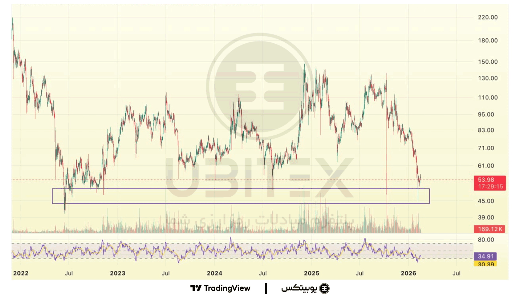 لایتکوین پس از ریزش سنگین به محدودهی حمایتی کلیدی ۴۴–۵۰ دلار رسیده که سابقهی واکنشهای قوی قیمتی دارد و میتواند کف موقت بازار باشد. در صورت تثبیت این ناحیه، سناریوی نوسان و برگشت اصلاحی تا مقاومت ۶۰–۶۶ دلار فعال میشود؛ شکست حمایت، ریسک ادامهی فشار فروش را بالا میبرد.