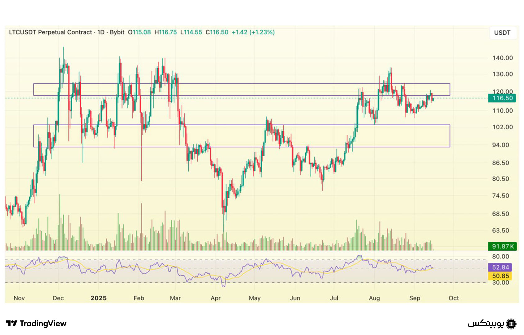 لایت کوین: در لایتکوین، محدوده حمایتی در بازه ۹۳ تا ۱۰۳ دلار تعریف شده و سطح مقاومتی بین ۱۱۶ تا ۱۲۴ دلار قرار دارد. واکنش قیمت به این سطوح میتواند روند آتی لایت کوین را مشخص کرده و بیانگر قدرت نسبی خریداران یا فروشندگان باشد.