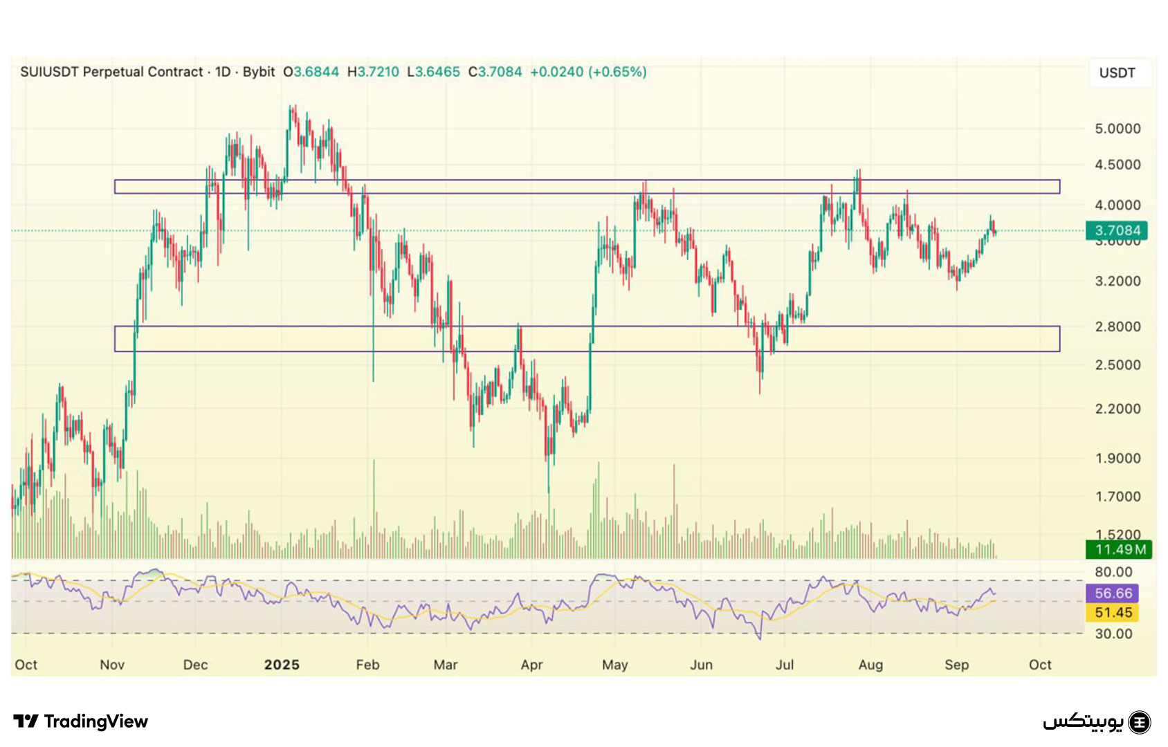 سویی: در سویی، محدوده حمایتی در بازه ۲.۶ تا ۲.۸ دلار تعیین شده و مقاومتها در سطح ۴.۱ تا ۴.۳ دلار قرار دارند. بررسی واکنش قیمت به این سطوح میتواند مسیر حرکتی سویی را مشخص کرده و میزان برتری تقاضا یا عرضه را نشان دهد.