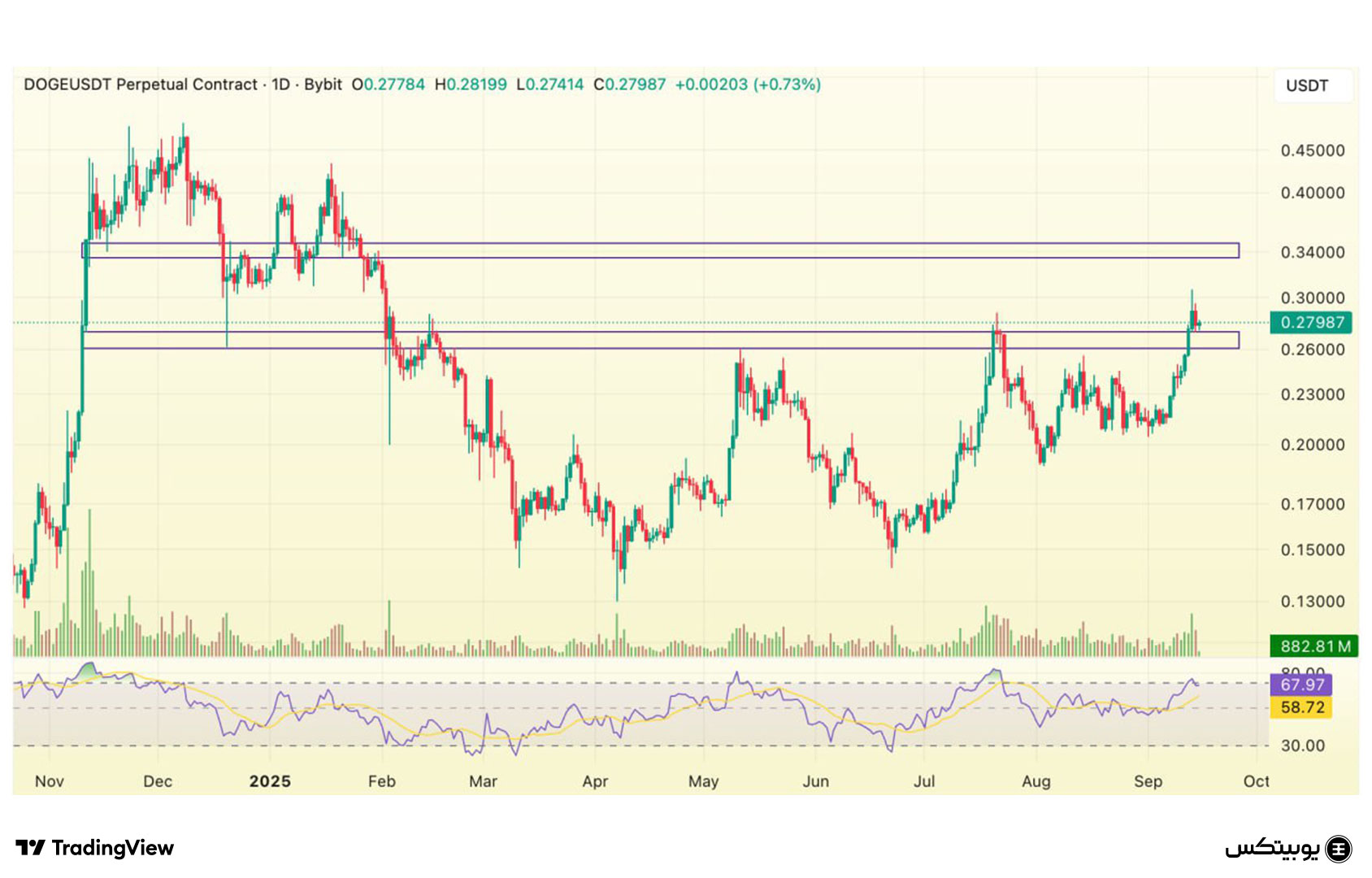دوج کوین: در دوجکوین، محدوده حمایتی بین ۰.۲۶۱ تا ۰.۲۷۲ دلار تعریف شده و مقاومتها در بازه ۰.۳۳۴ تا ۰.۳۴۸ دلار قرار دارند. واکنش قیمت به این سطوح میتواند نقاط حساس برای ورود یا خروج کوتاهمدت معاملهگران را آشکار سازد.
