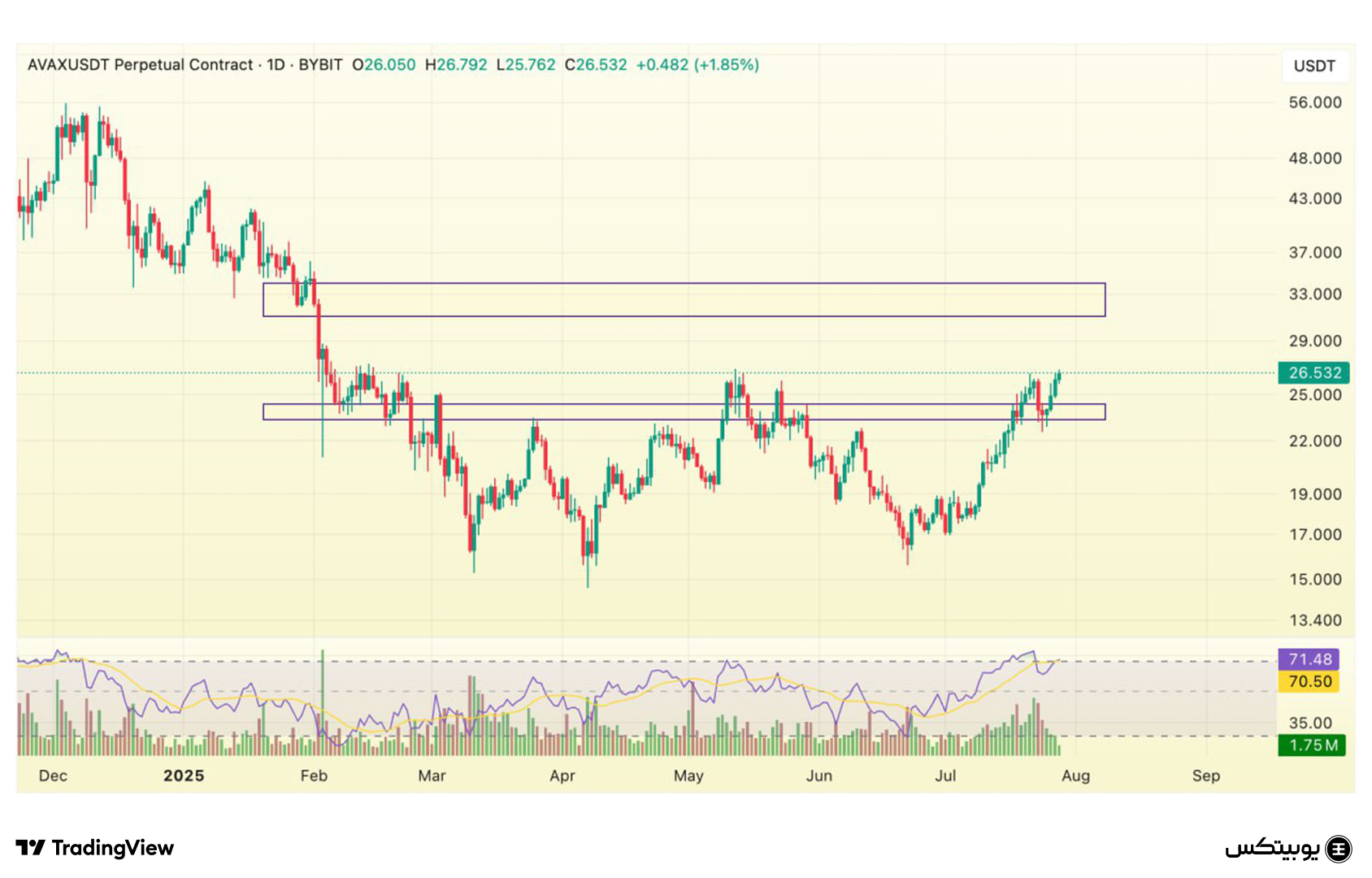 آواکس: حمایت آوالانچ در بازه ۲۳.۳ تا ۲۴.۳ دلار قرار دارد و مقاومت آن بین ۳۰.۹ تا ۳۳.۹ دلار دیده میشود. معاملهگران بهتر است رفتار قیمت را در این نواحی با دقت دنبال کنند.