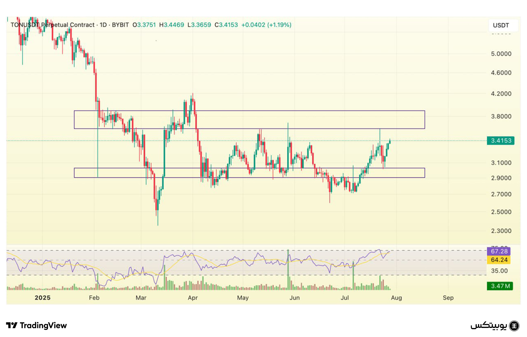 تون کوین: محدوده حمایتی تون کوین بین ۲.۹ تا ۳ دلار قرار گرفته و محدوده مقاومتی آن در بازه ۳.۶ تا ۳.۸ دلار واقع شده است. این سطوح کلیدی میتوانند نقش مهمی در جهتگیری قیمتی آینده این رمزارز ایفا کنند.