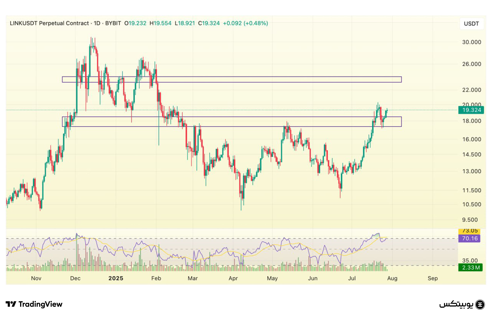 چین لینک: محدوده حمایتی چینلینک در بازه ۱۷.۳ تا ۱۸.۴ دلار قرار دارد و مقاومت آن بین ۲۳ تا ۲۳.۸ دلار دیده میشود. در صورت نزدیکشدن به این سطوح، امکان اصلاح یا ادامه حرکت وجود دارد که نیازمند رصد دقیق است.