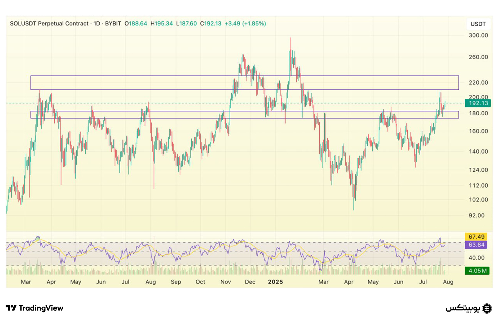 سولانا: سطوح حمایتی سولانا در محدوده ۱۷۴ تا ۱۸۲ دلار قرار دارد و در صورت حفظ این کف، احتمال حرکت به سمت مقاومتهای ۲۱۰ تا ۲۳۰ دلار وجود دارد. این بازهها میتوانند نشانههای مهمی برای مدیریت موقعیتهای خرید یا فروش باشند.