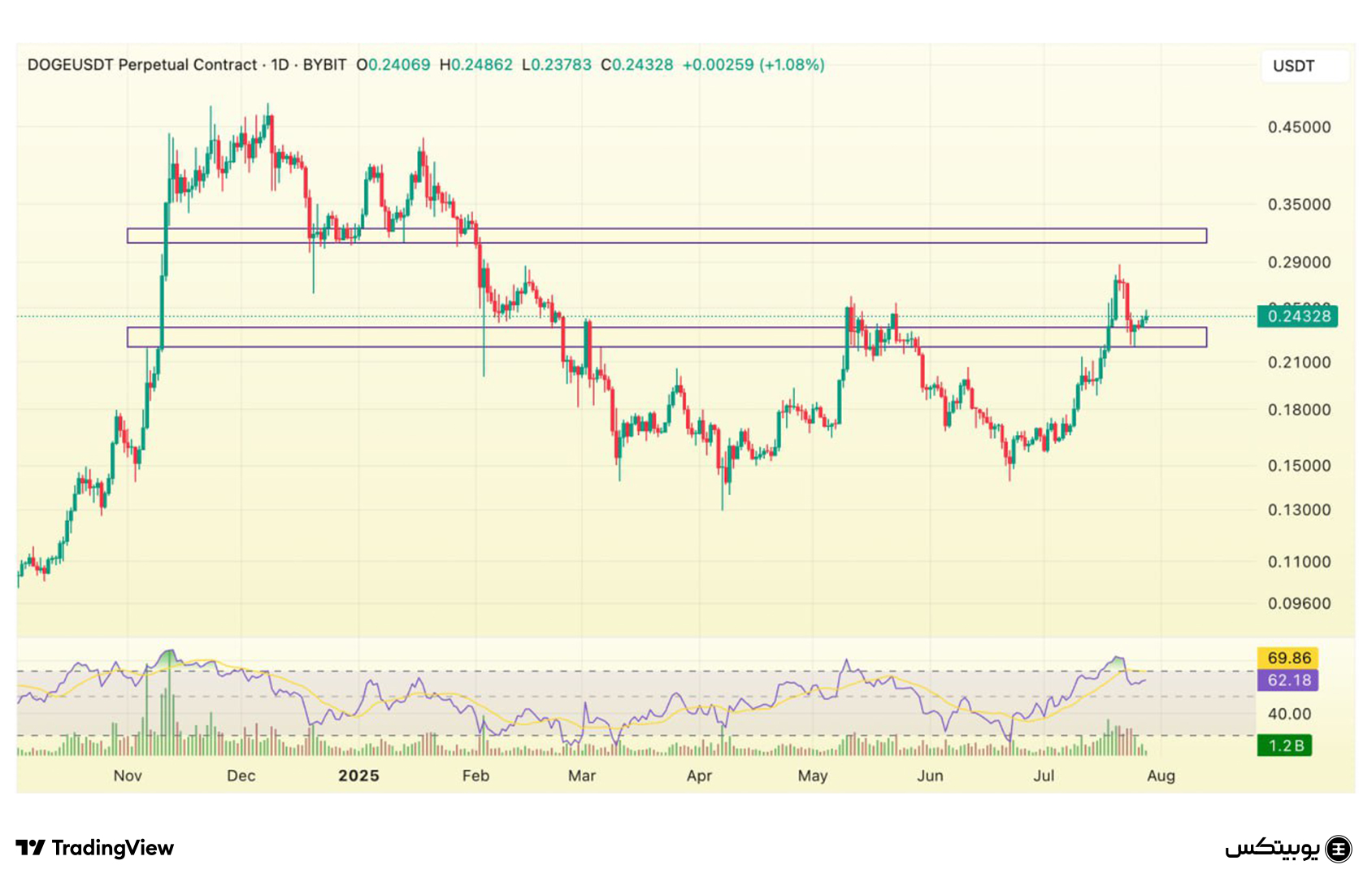 دوج کوین: محدوده حمایتی دوج کوین بین ۰.۲۲ تا ۰.۲۳۵ دلار قرار دارد و در صورت ادامه حرکت صعودی، مقاومت مهم آن در بازه ۰.۳۰ تا ۰.۳۲ دلار دیده میشود. این بازهها میتوانند مسیر حرکتی بعدی را مشخص کنند.