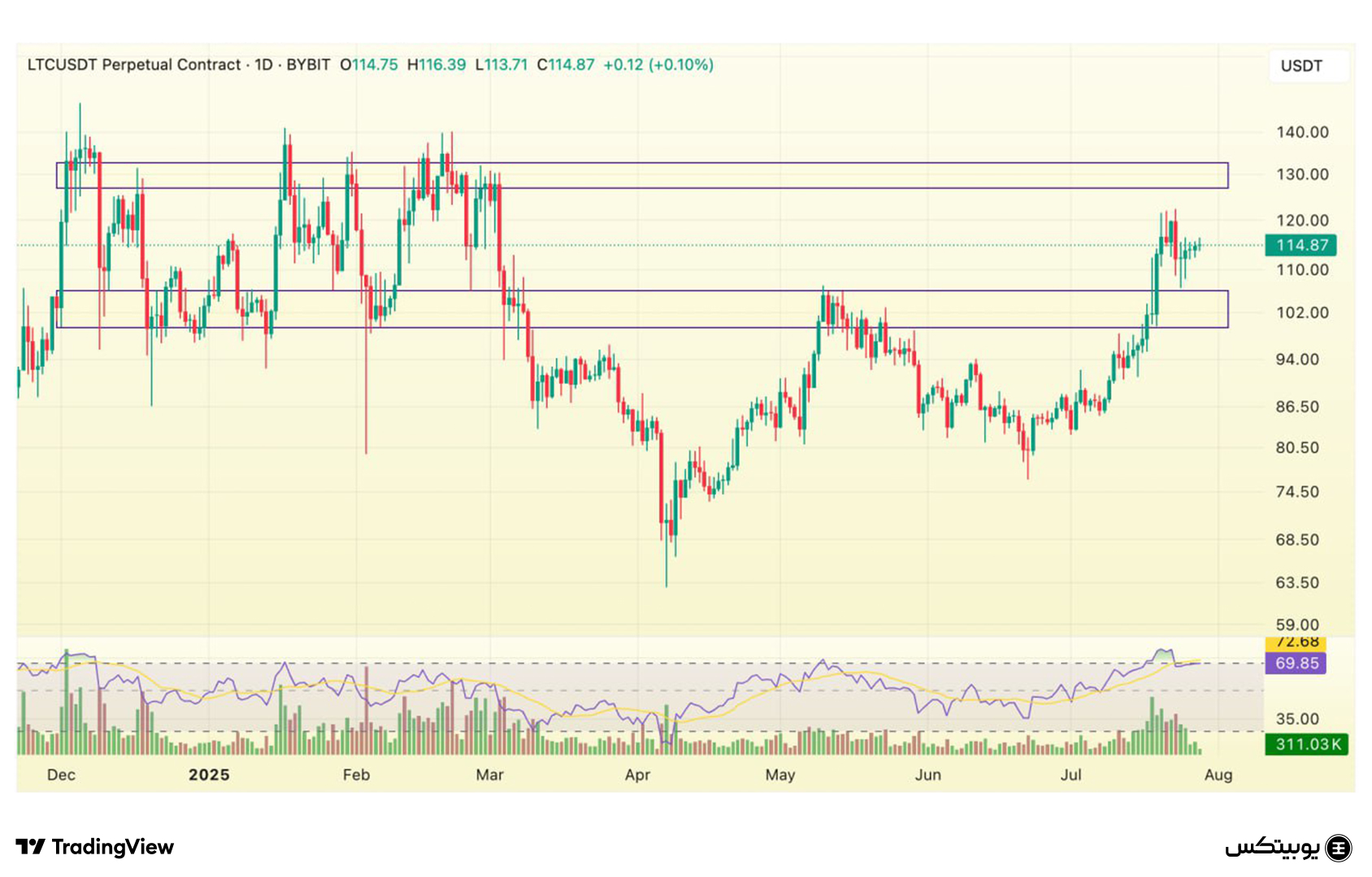 لایت کوین: محدوده حمایتی لایت کوین در بازه ۹۸ تا ۱۰۴ دلار قرار دارد و محدوده مقاومتی آن بین ۱۲۷ تا ۱۳۲ دلار است. این نقاط میتوانند بهعنوان مرزهای مهم برای تحلیل روند قیمتی این رمزارز مورد توجه باشند.