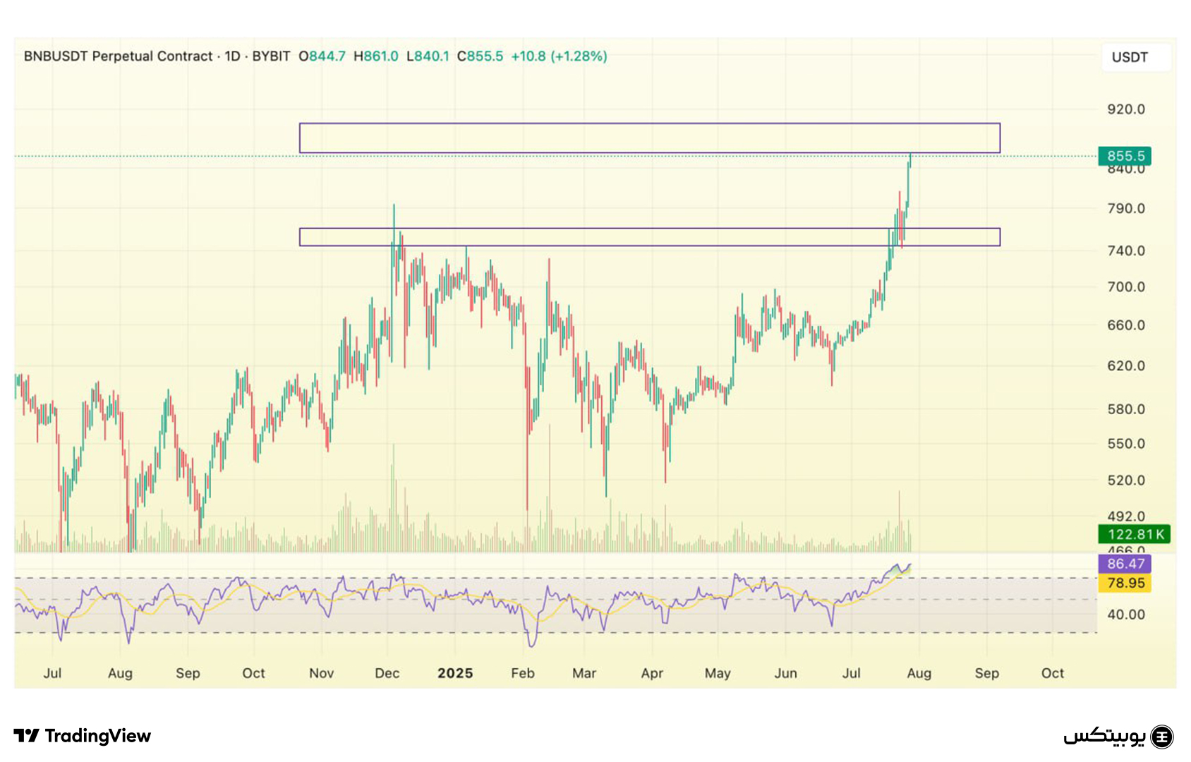 بایننس کوین: محدوده حمایتی بایننس کوین بین ۷۴۵ تا ۷۶۵ دلار قرار دارد و محدوده مقاومتی آن در بازه ۸۶۰ تا ۹۰۰ دلار است. این نقاط کلیدی میتوانند نقش مهمی در جهت حرکت قیمت این ارز دیجیتال ایفا کنند.