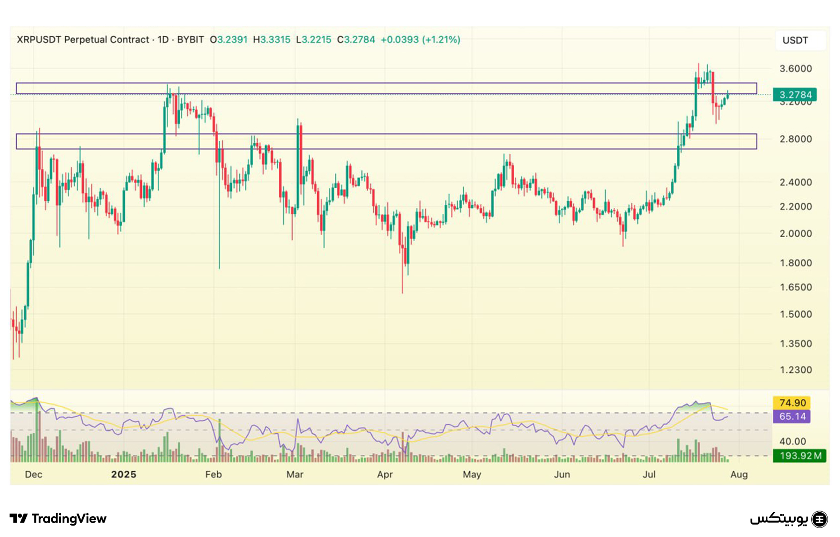 ریپل: محدوده حمایتی ریپل در بازه ۲.۷ تا ۲.۸۵ دلار قرار دارد و محدوده مقاومتی آن بین ۳.۲۷ تا ۳.۴۱ دلار است. این سطوح کلیدی برای تعیین حرکتهای احتمالی قیمت ریپل اهمیت دارند.