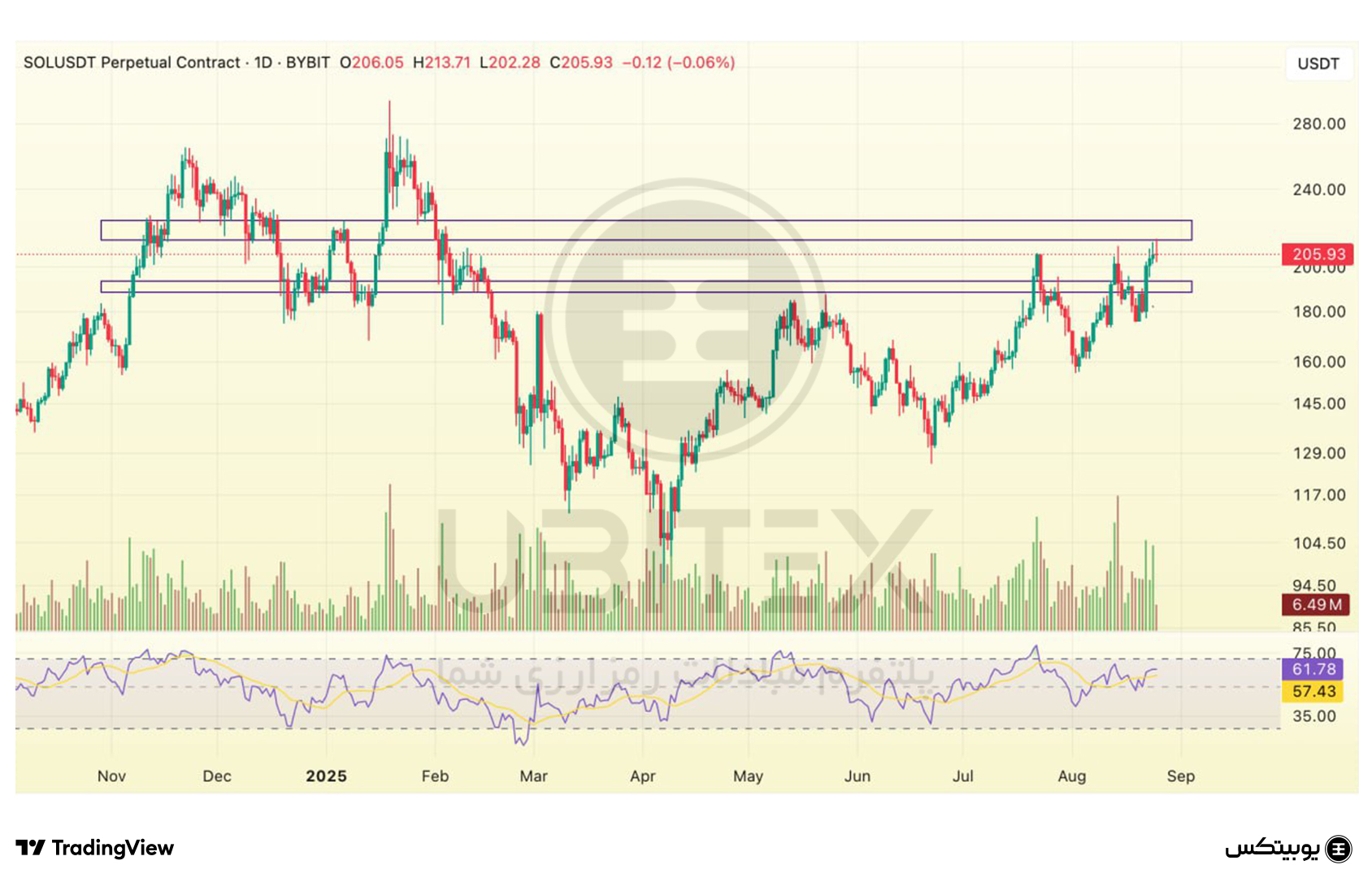 سولانا: محدوده حمایتی سولانا در بازه ۱۸۸ تا ۱۹۴ دلار قرار دارد. محدوده مقاومتی آن نیز بین ۲۱۳ تا ۲۲۳ دلار تعریف شده است. واکنش قیمت به این سطوح میتواند مسیر بعدی حرکت سولانا را مشخص کند؛ نزدیکشدن به مقاومت میتواند فشار فروش را افزایش دهد، در حالی که حفظ حمایت نشانهای از تقویت روند صعودی خواهد بود.