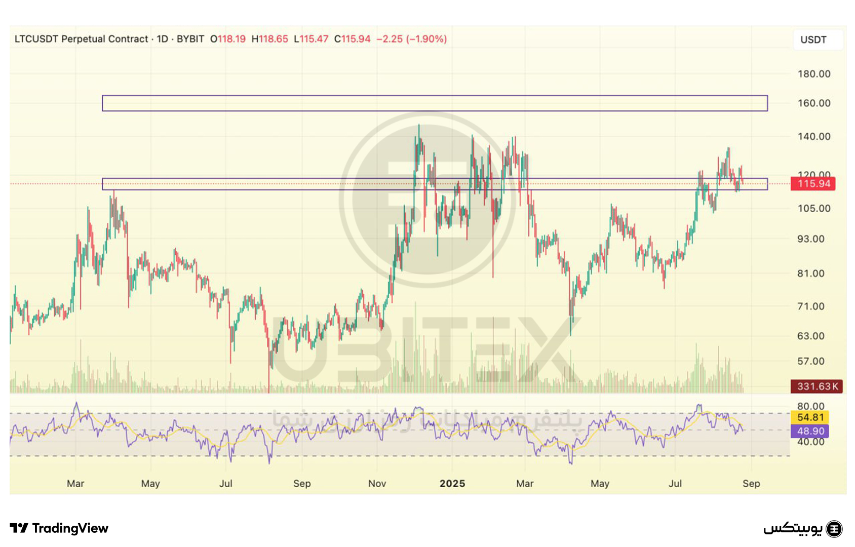 لایت کوین: محدوده حمایتی لایتکوین روی ۱۱۳ تا ۱۱۸ دلار قرار دارد. محدوده مقاومتی آن نیز در بازه ۱۵۵ تا ۱۶۵ دلار مشخص شده است. معاملهگران باید توجه داشته باشند که حفظ حمایت میتواند زمینهساز حرکت صعودی باشد، در حالیکه واکنش به مقاومتها میتواند فشار فروش را افزایش دهد.
