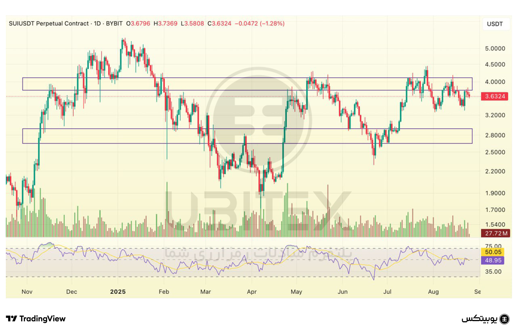 سویی: محدوده حمایتی سویی در بازه ۲.۶۵ تا ۲.۹ دلار قرار دارد. محدوده مقاومتی آن نیز بین ۳.۷ تا ۴.۱ دلار تعریف شده است. حفظ سطح حمایتی میتواند مبنای ادامه روند صعودی باشد، اما نزدیکشدن به مقاومتها احتمال افزایش فشار فروش را بالا میبرد.