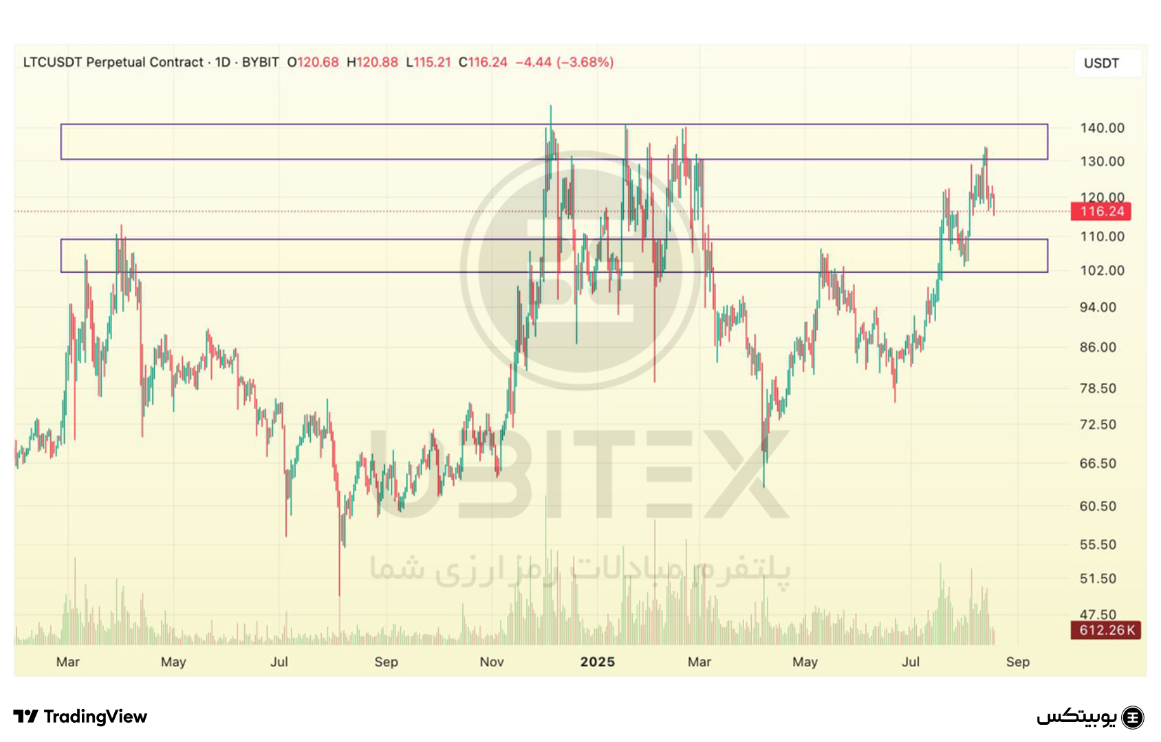 لایت کوین: محدوده حمایتی لایت کوین بین ۱۰۱ تا ۱۰۹ دلار و محدوده مقاومتی آن در ۱۳۰ تا ۱۴۱ دلار قرار دارد. این سطوح میتوانند نقش کلیدی در تعیین روند قیمت و فرصتهای معاملاتی آینده ایفا کنند.