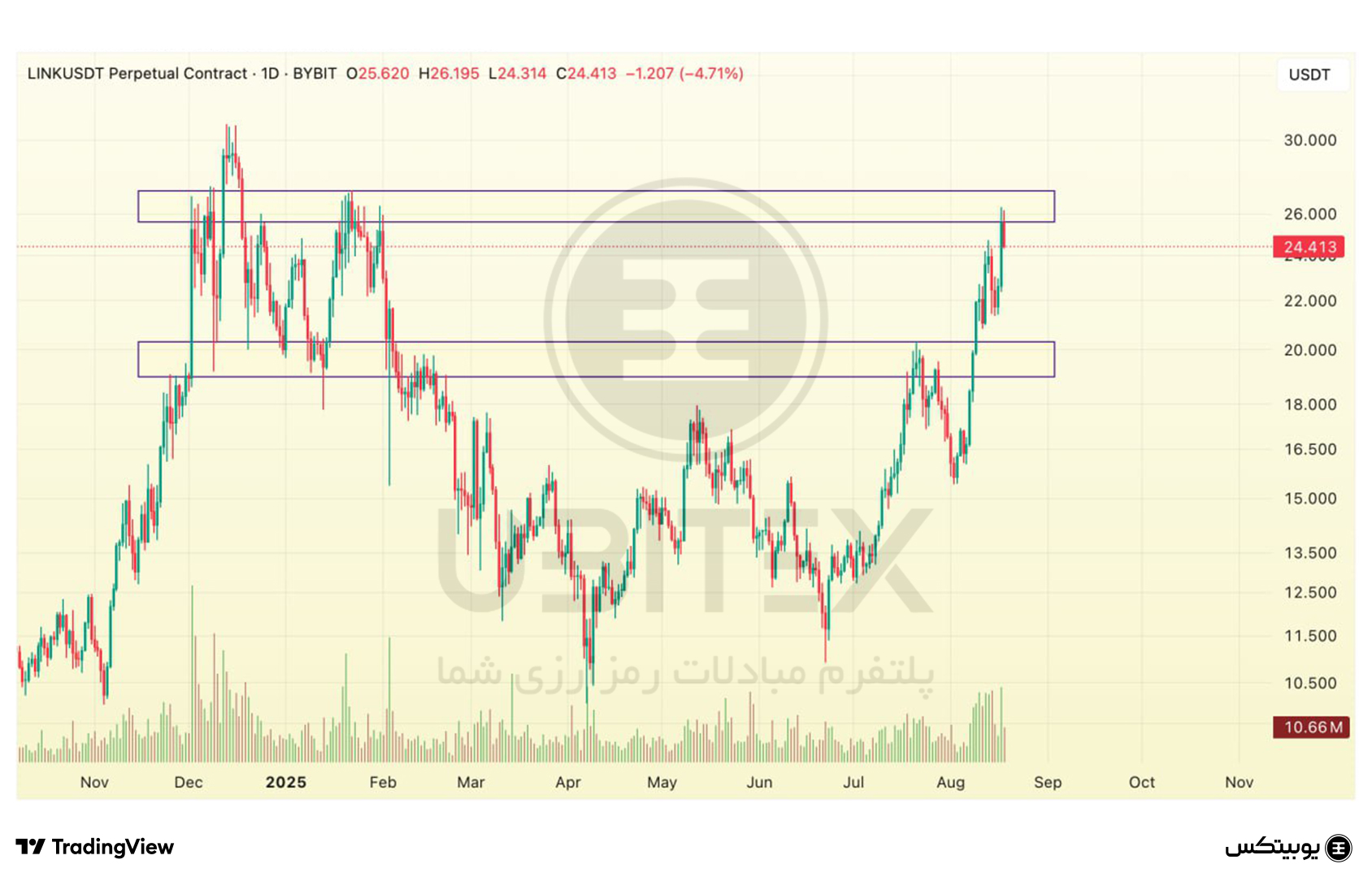 چین لینک: محدوده حمایتی چین لینک بین ۱۸.۹ تا ۲۰.۳ دلار و محدوده مقاومتی آن در ۲۵.۵ تا ۲۷ دلار قرار دارد. این محدودهها میتوانند در شناسایی نقاط ورود و خروج برای معاملات اهمیت زیادی داشته باشند.