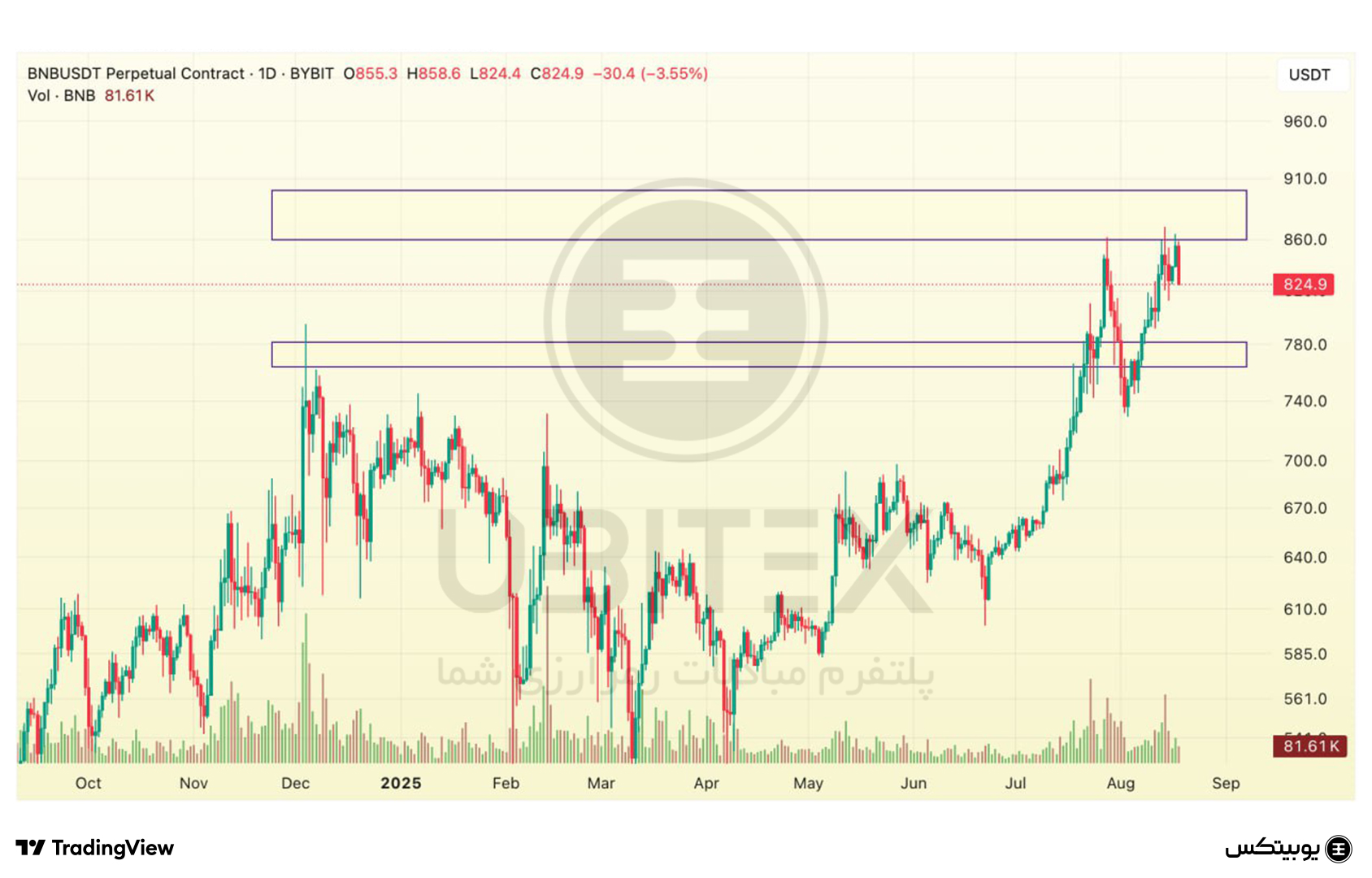 بایننس کوین: محدوده حمایتی بایننس کوین بین ۷۶۳ تا ۷۸۰ دلار و محدوده مقاومتی آن در ۸۶۰ تا ۹۰۰ دلار قرار دارد. این سطوح میتوانند برای تحلیل روند و برنامهریزی معاملاتی راهنمای خوبی باشند.